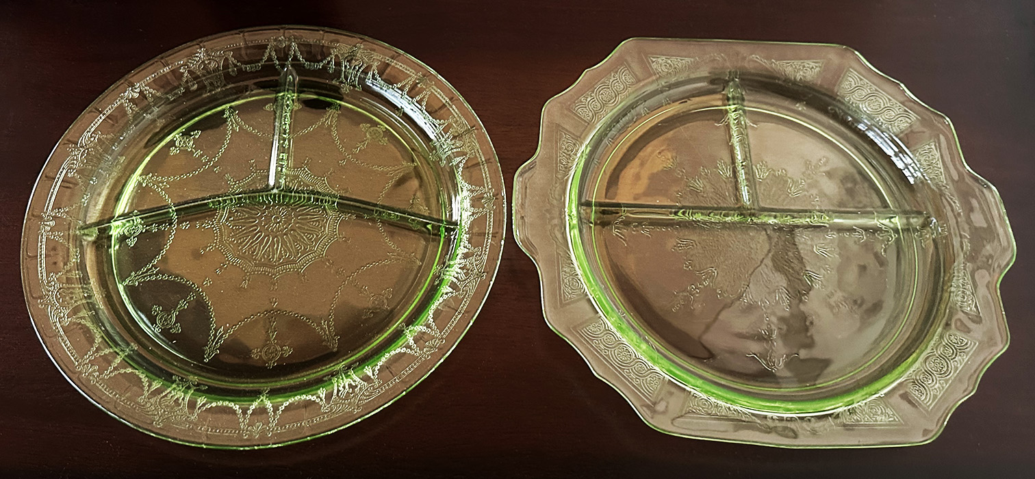 Pair Of Vintage 1930's Uranium Glass Grill Plates. Anchor Hocking / Princess Pattern. In Excellent Condition. 10.5" diameter and 10.5" x 11.5"