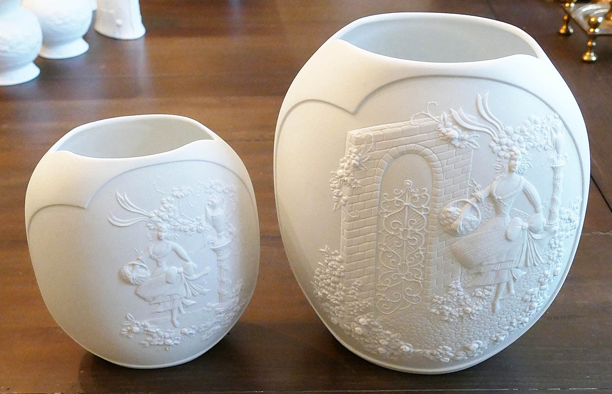 Pair Of Vintage Kaiser White Bisque Ceramic Flower Vases. 9.5" & 7" Tall. Both are in Very Good Condition.