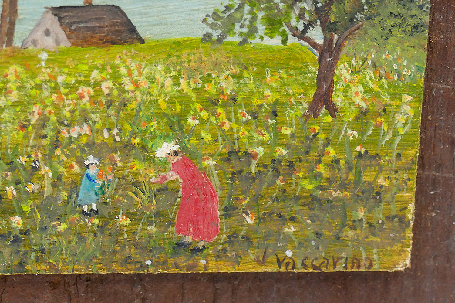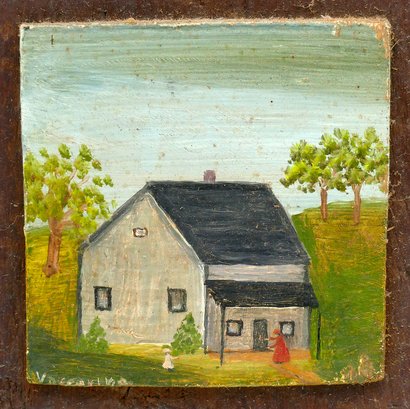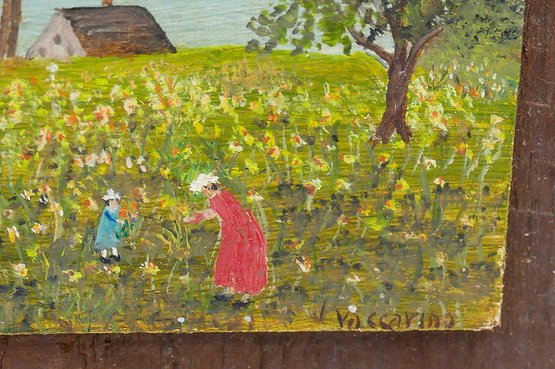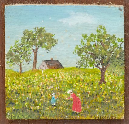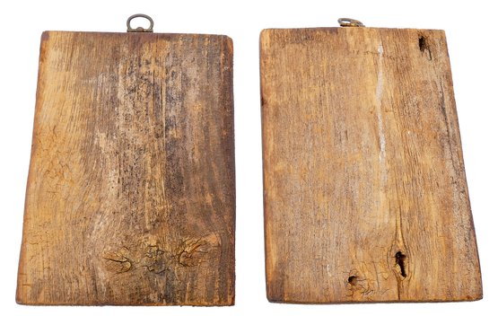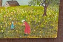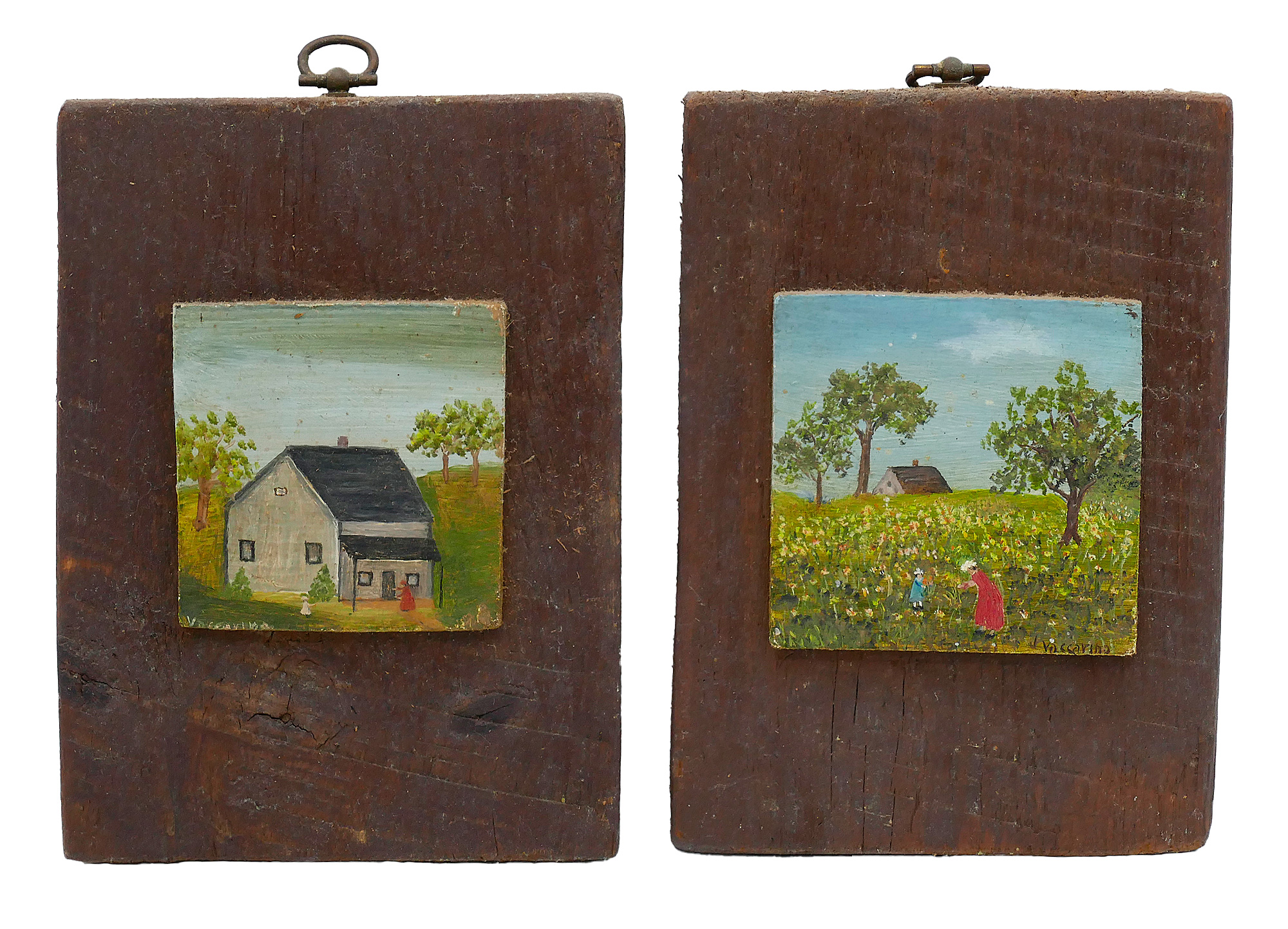 Pair Of Vintage Miniature Paintings on Wood. Each painting is on approximately a 3" x 3" wood plank and mounted to a 5" x 7" piece of wood. In good condition with some dust.