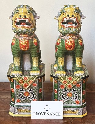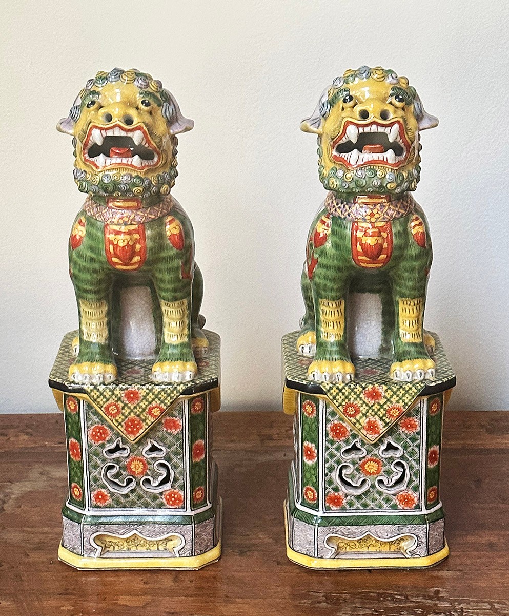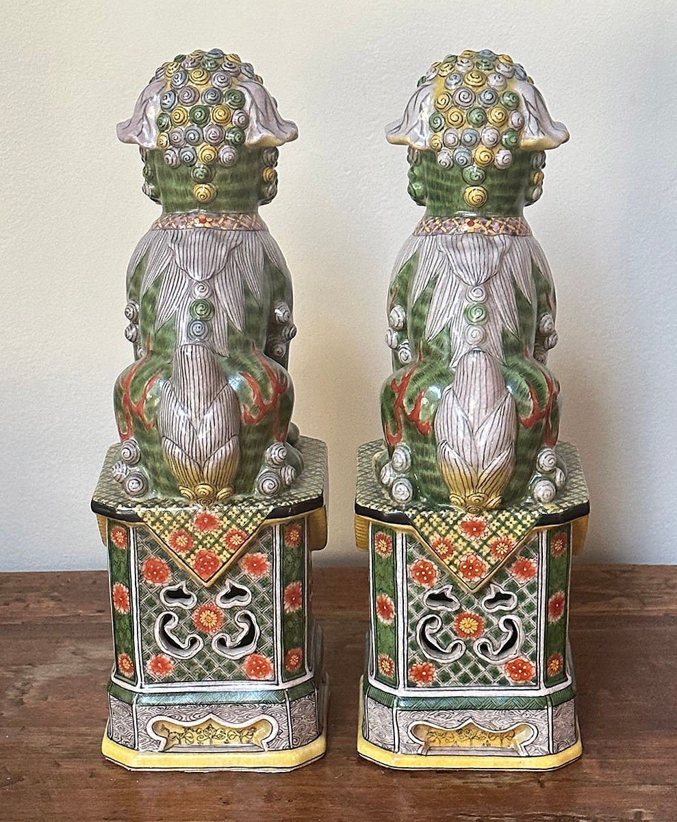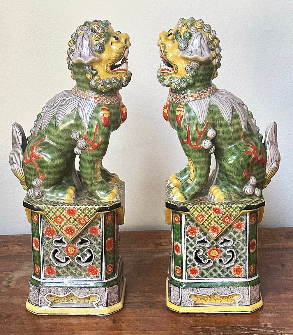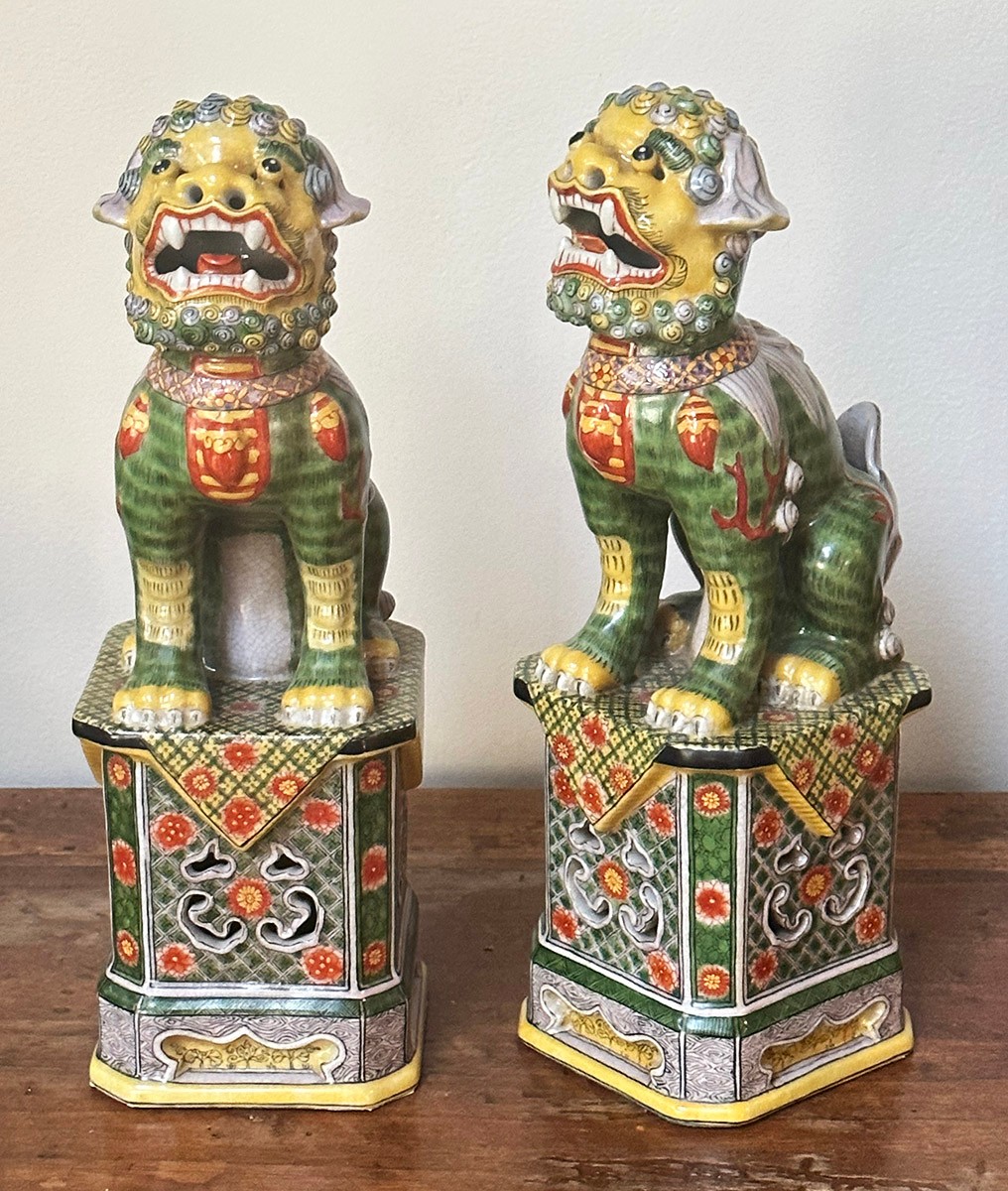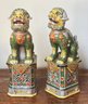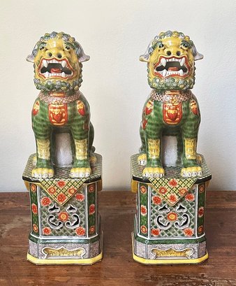 Pair Of Vintage Porcelain Foo Dogs. Detailed multicolored paint in Very Good/Excellent Condition. 13" tall.