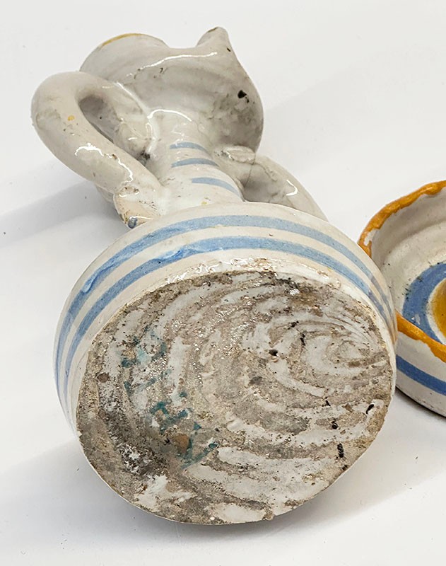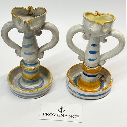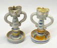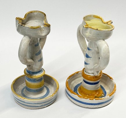 Pair Of Vintage Sicilian South Italian Pair of Majolica Ceramic Candlesticks. 8" Tall. In good condition with some glaze/surface cracks.
