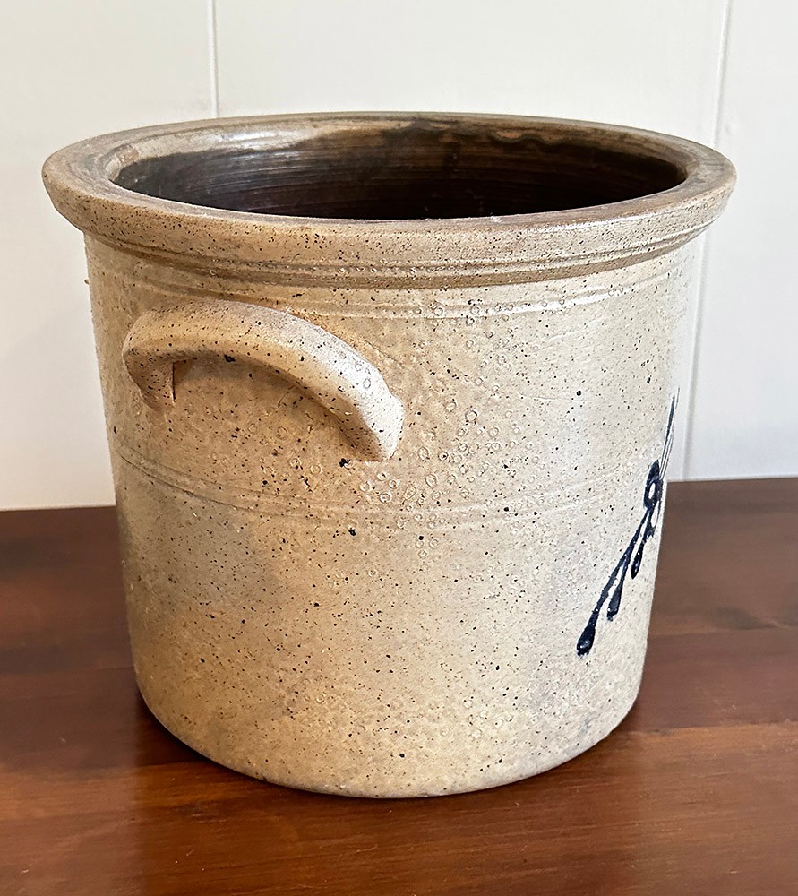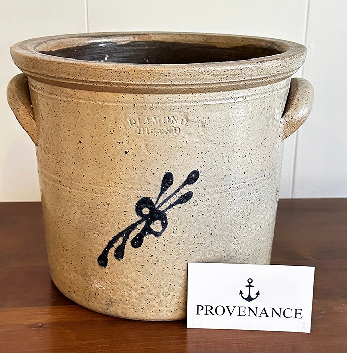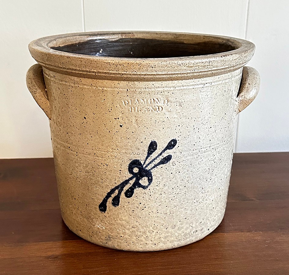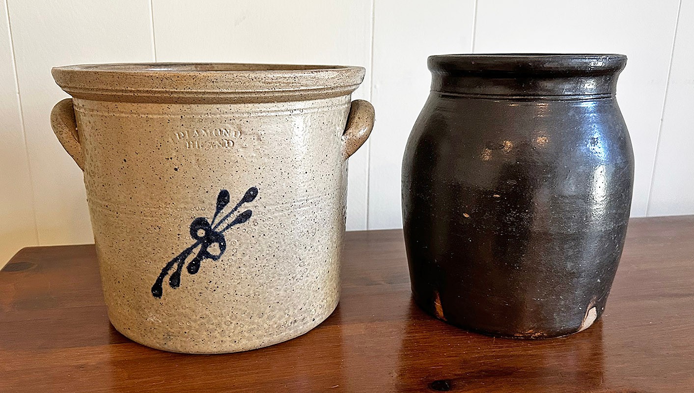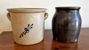 Pair Of Vintage Stoneware Pottery. Includes a Diamond Brand Crock (Very Good Condition) and a Jug (good condition, some missing glaze). 8-8.5" tall.