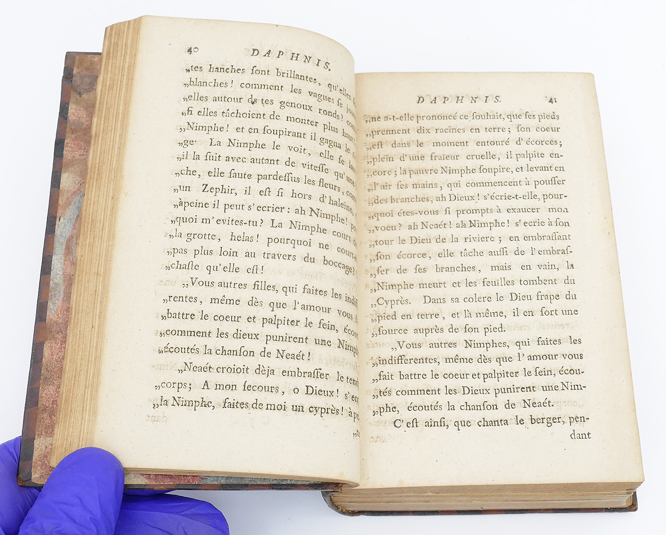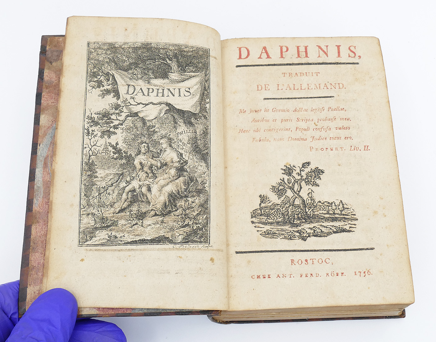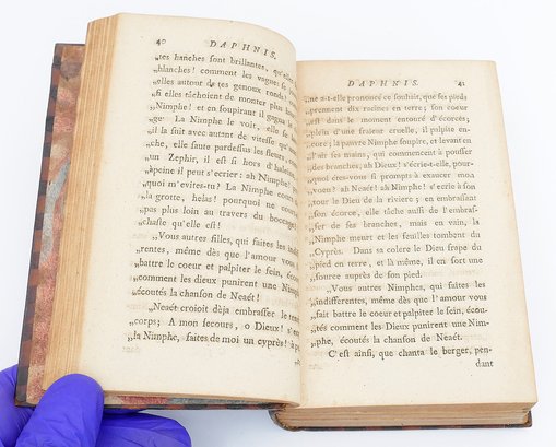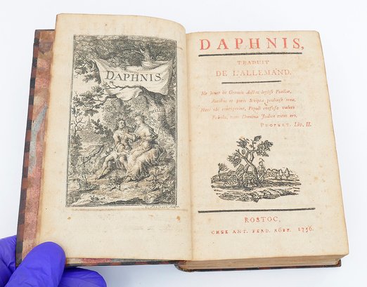 Book On Daphnis From 1756. In French. Leather spine and cover. Some wear to the leather, pages are in good condition. 6.25" x 4" (Book Size).