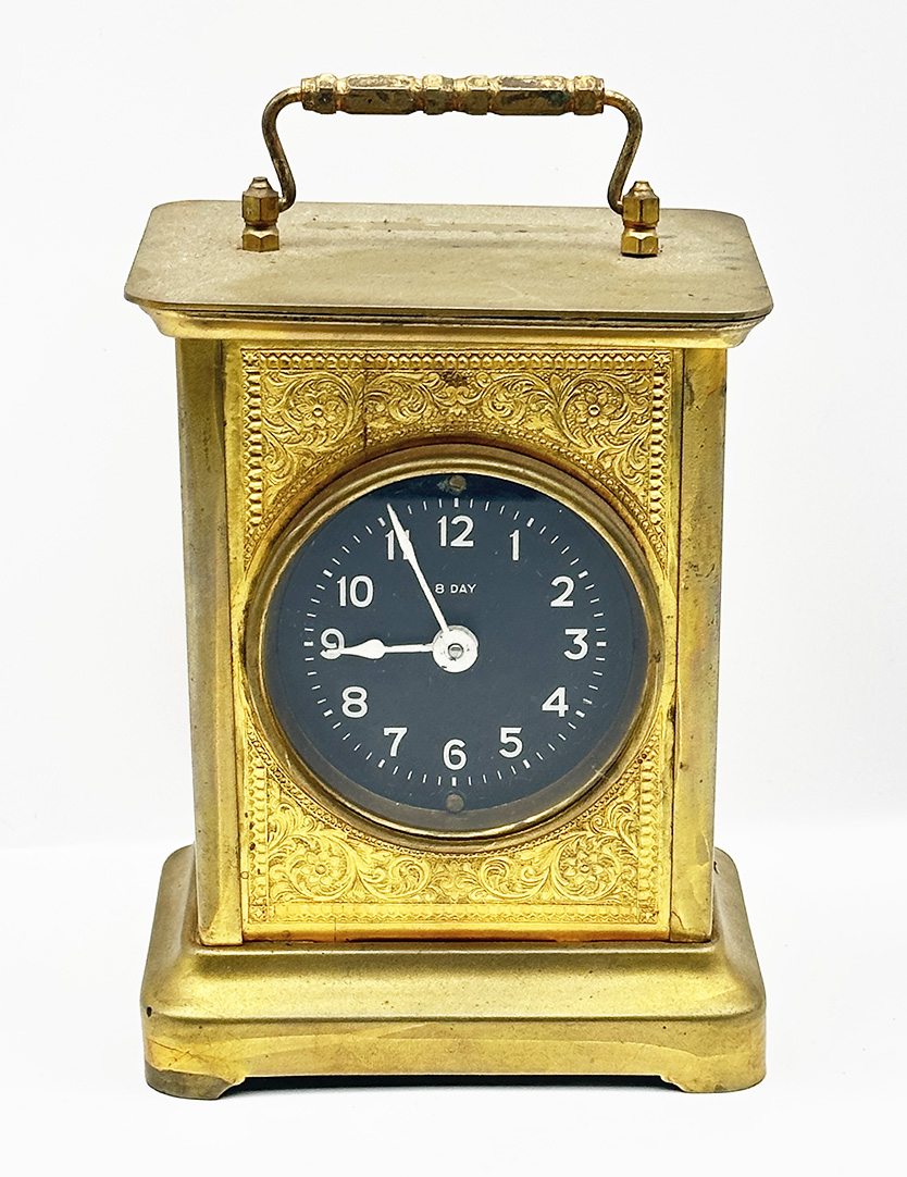 Antique Waterbury Clock Co 8-Day Carriage Brass Clock. Case is dated 1887, the Mechanism is dated 1891. Untested, in Very Good Cosmetic Condition. Winding key not included. 4.5"w x 3.25"d x 6.5"h
