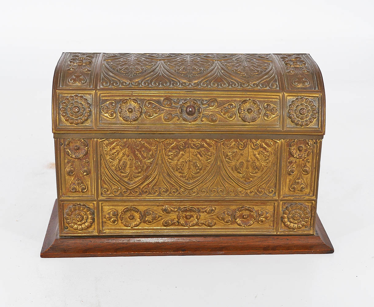 Antique Art Nouveau Brass And Wood Letter Holder. Hammered/Pressed brass with art nouveau floral motifs and wood backing and dividers. Includes a note from 1975 discussing an identical piece.