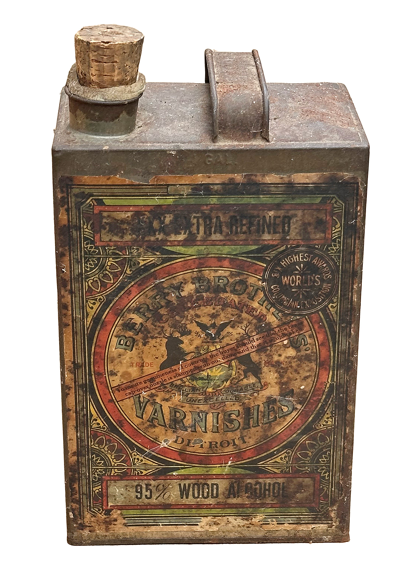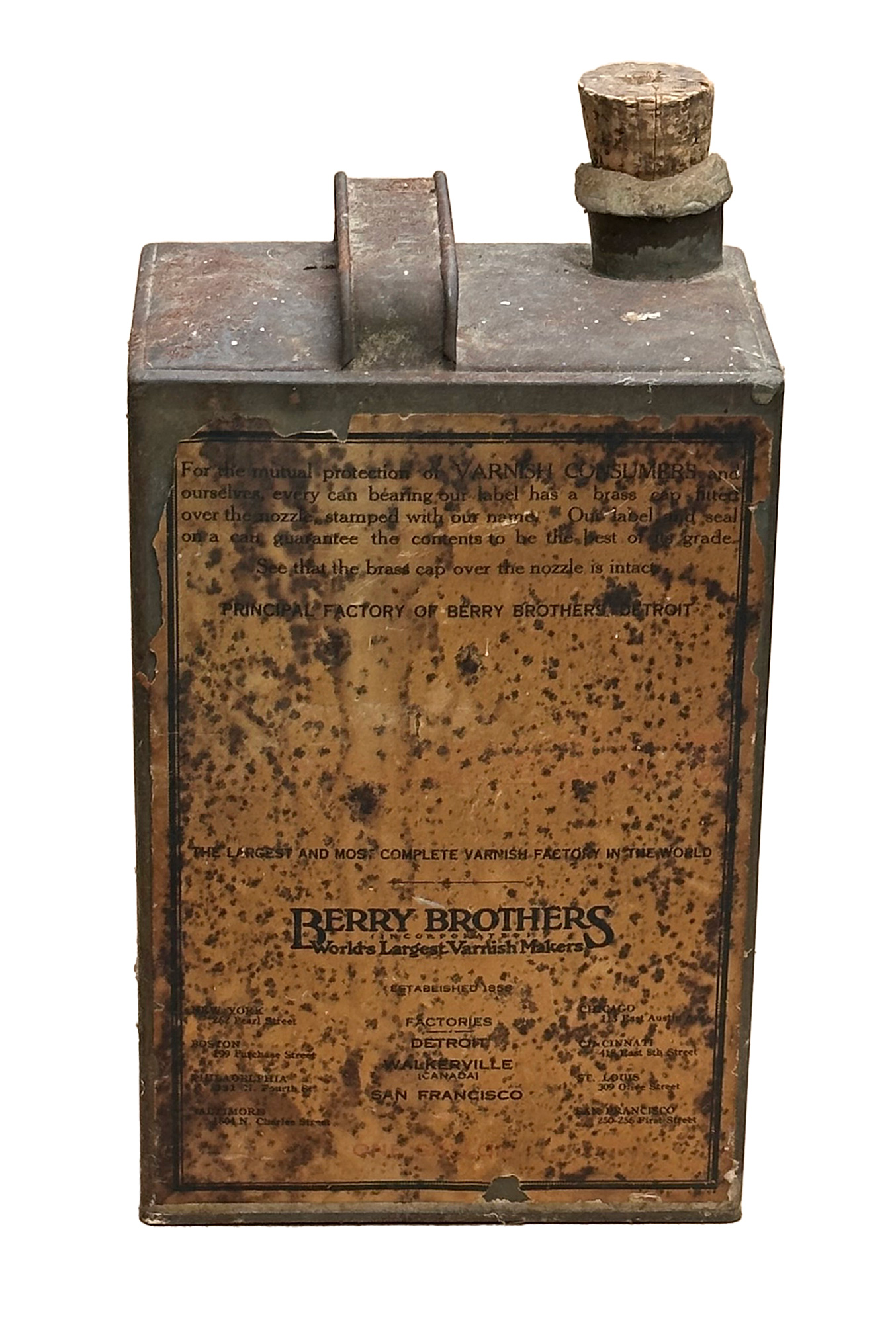 Antique Berry Brothers (Detriot) Varnish Tin - Gallon Size. Circa Late 19th / Early 20th C. Nice display piece. 12" Tall, 6" wide, 4.25" deep.