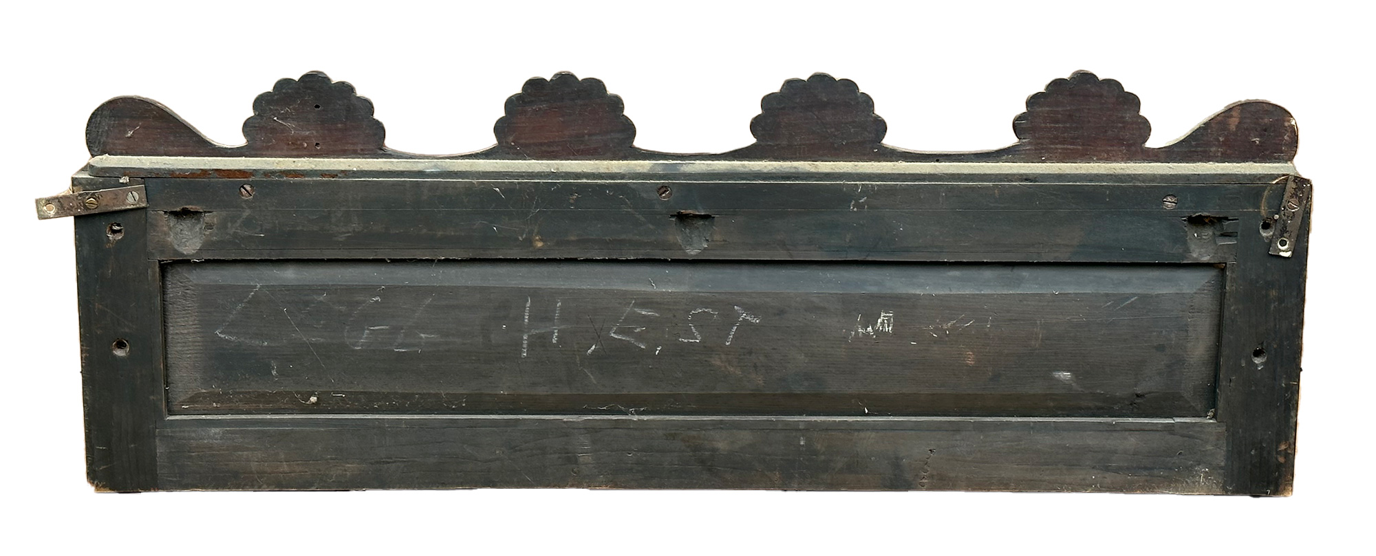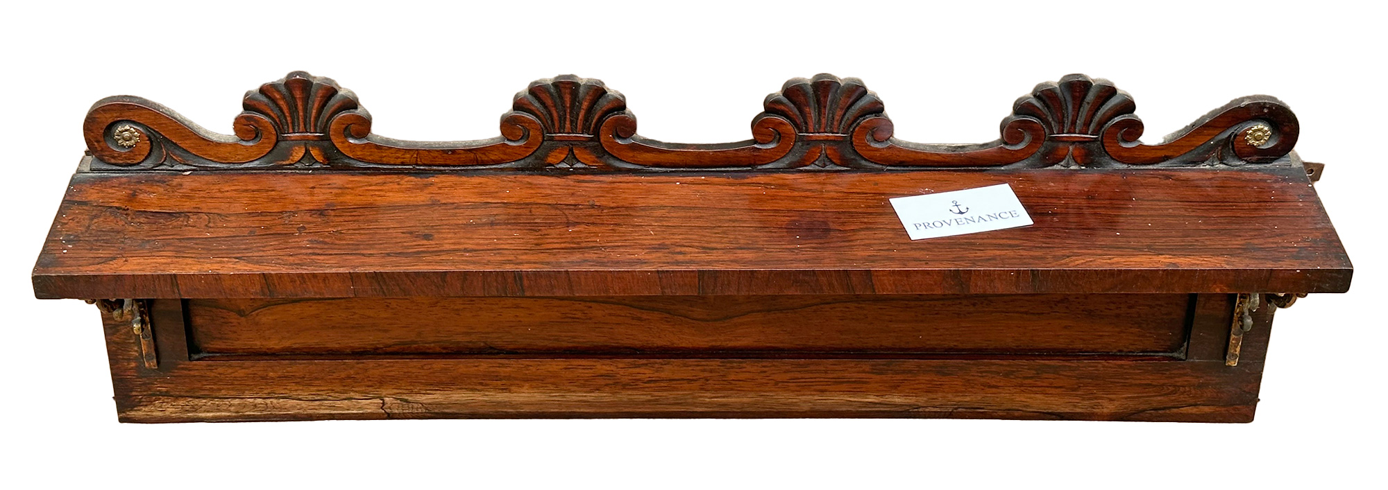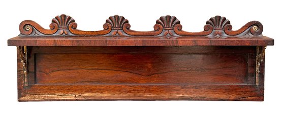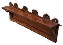 Antique Carved Rosewood Hanging Wall Shelf. 35.25" Wide. Carved shell and scroll design with gold metal brackets. In Good Condition. 35.25"w x 12.25"h x 6"d