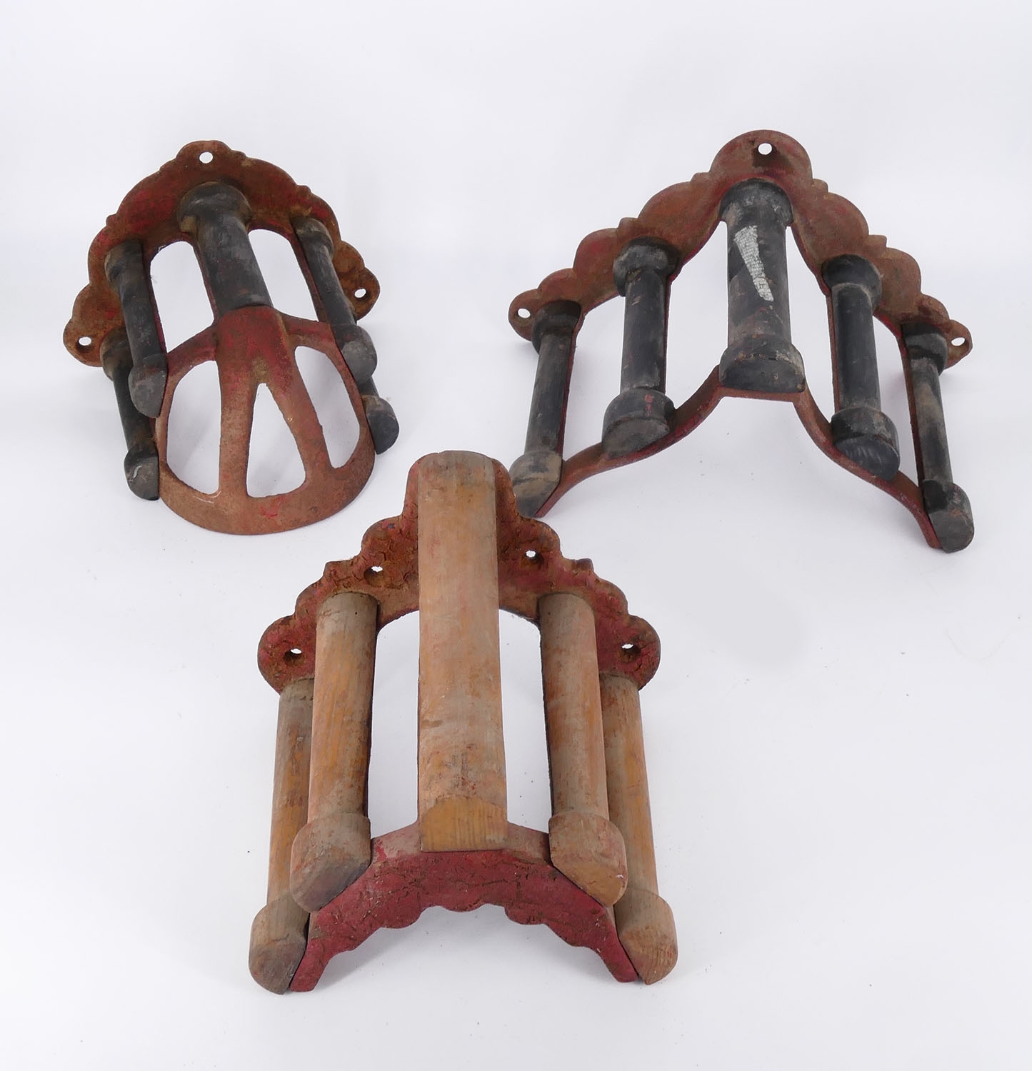 Antique Cast Iron & Wood Stable Wall-mount Saddle, Tack, And Bridal Racks. Two of the racks were made by J. L. Mott Iron Works.