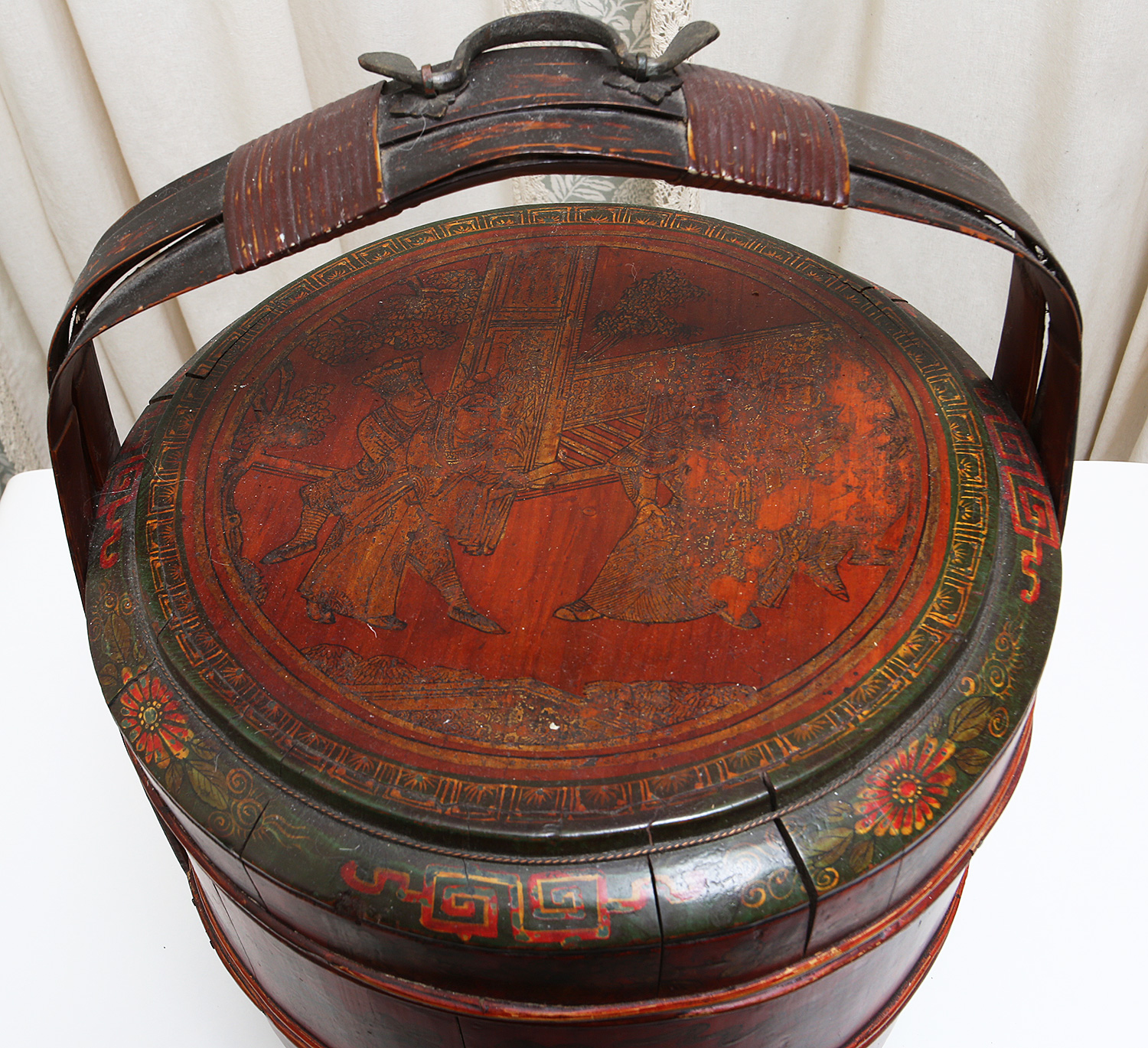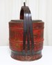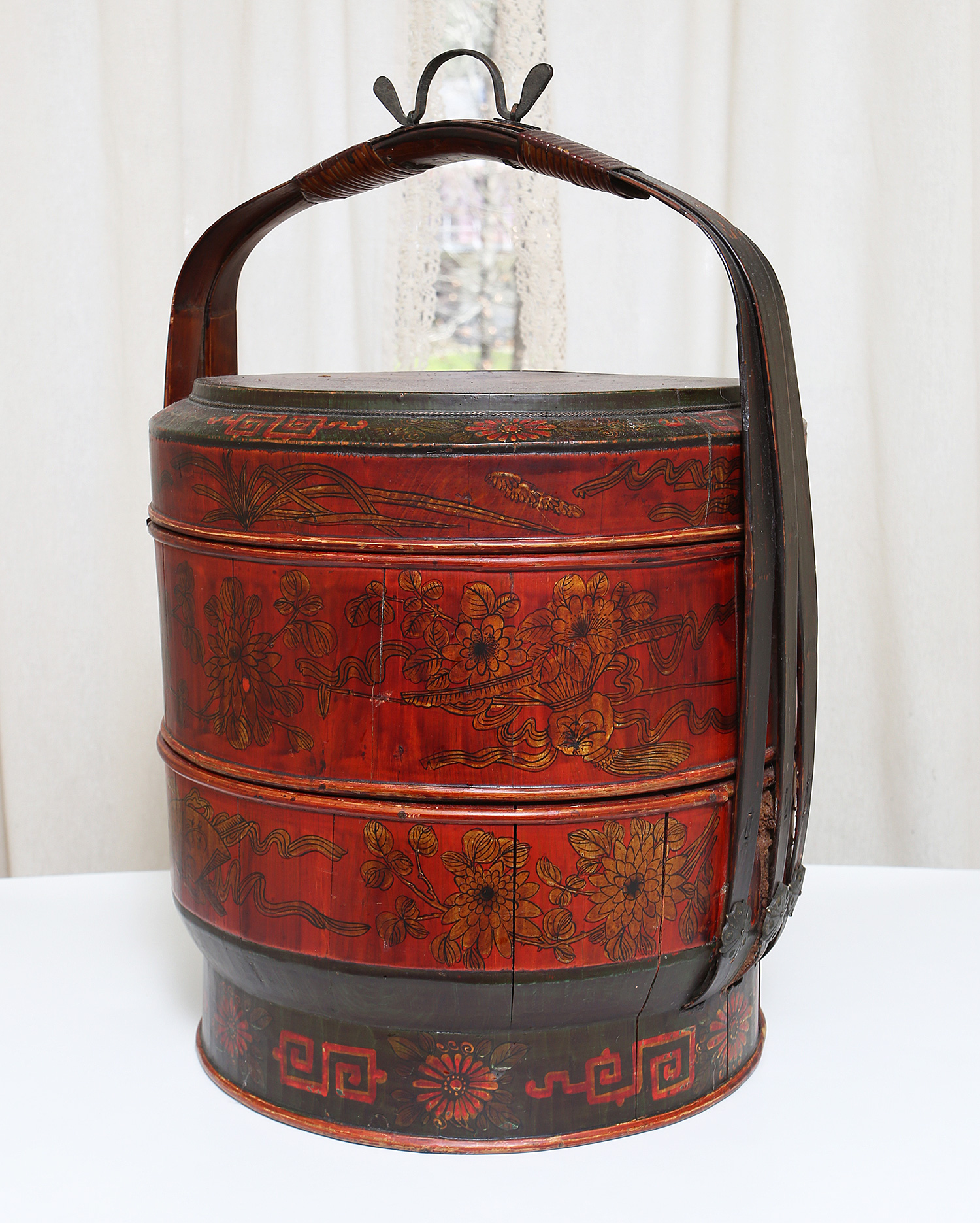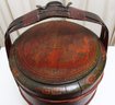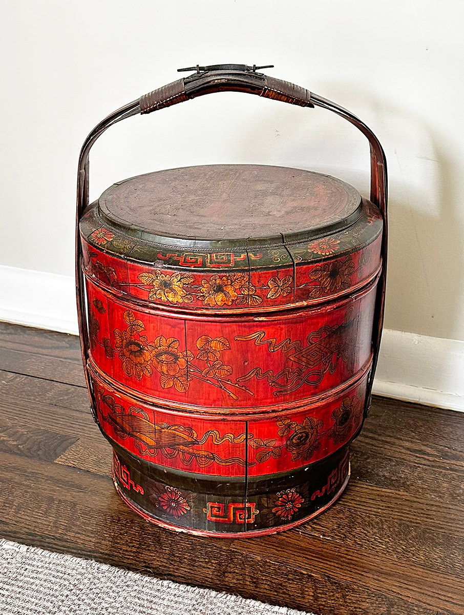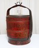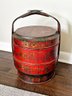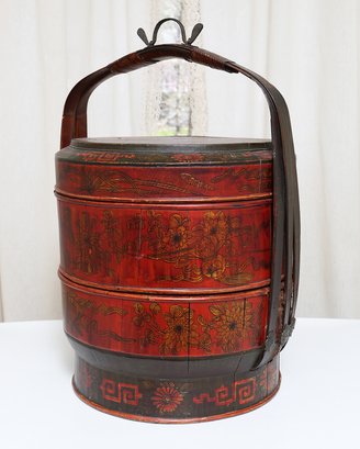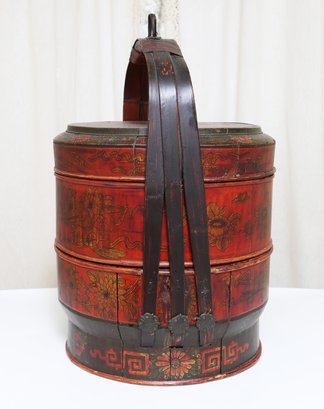 Antique Chinese Red Lacquer Wood and Gilt Yellow Nesting Wedding Basket w/Handle. In Very Good Condition. 14" x 14" x 19"h