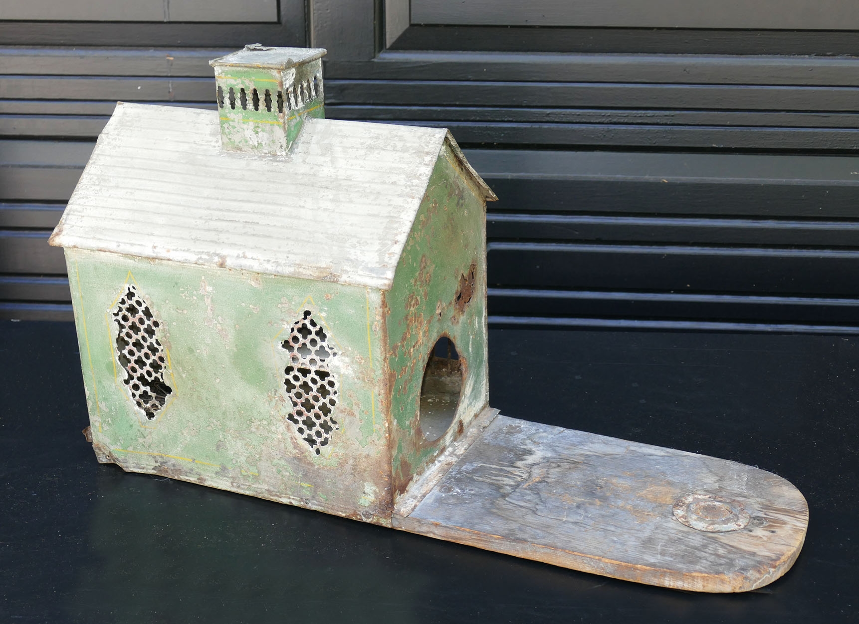 Folk Art Birdhouse. Tin and Wood Construction. Early 20th C. With back door, removable tray, and loft. Nice design.