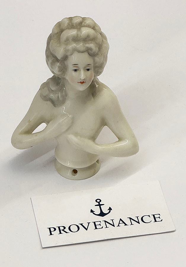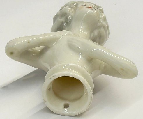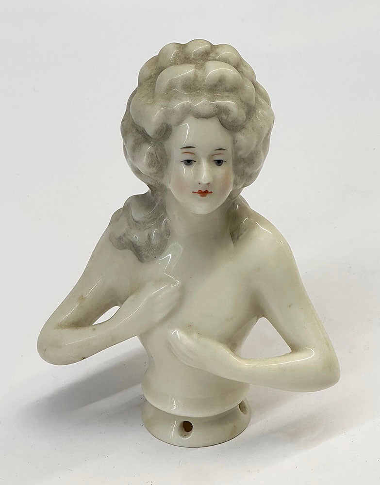 Antique German Marie-Antoinette Half-Doll / Pin-Cushion Ceramic Doll. Early 20th C. In Good Condition. 4.75" tall.