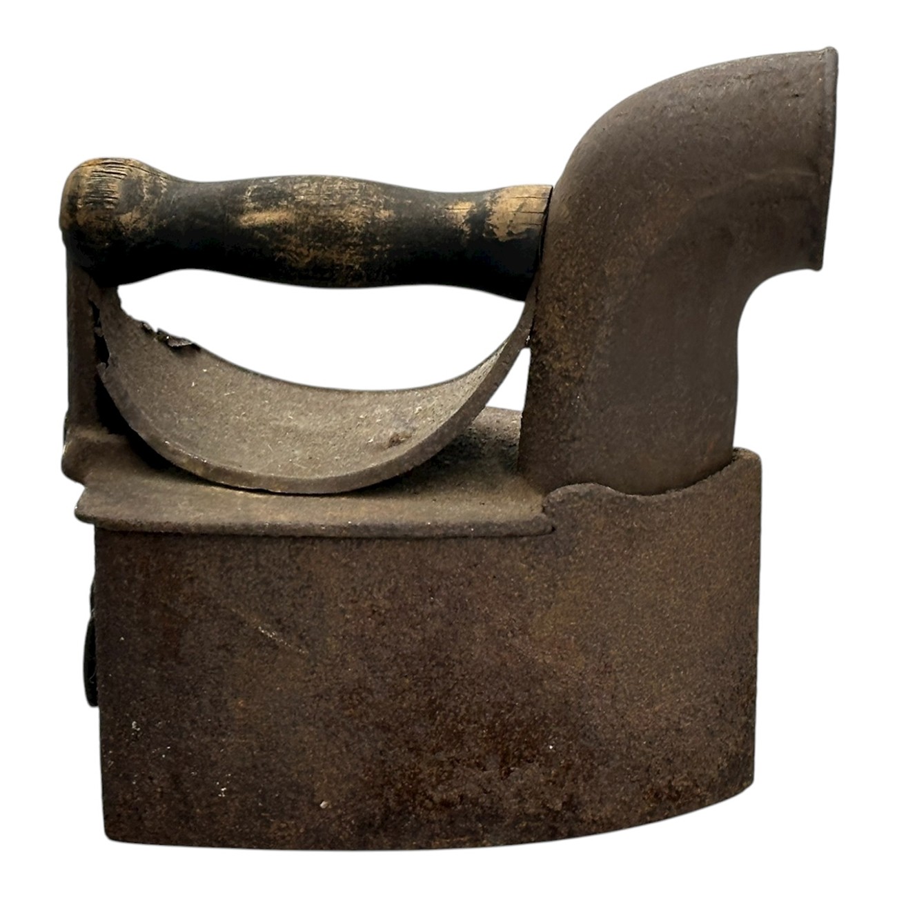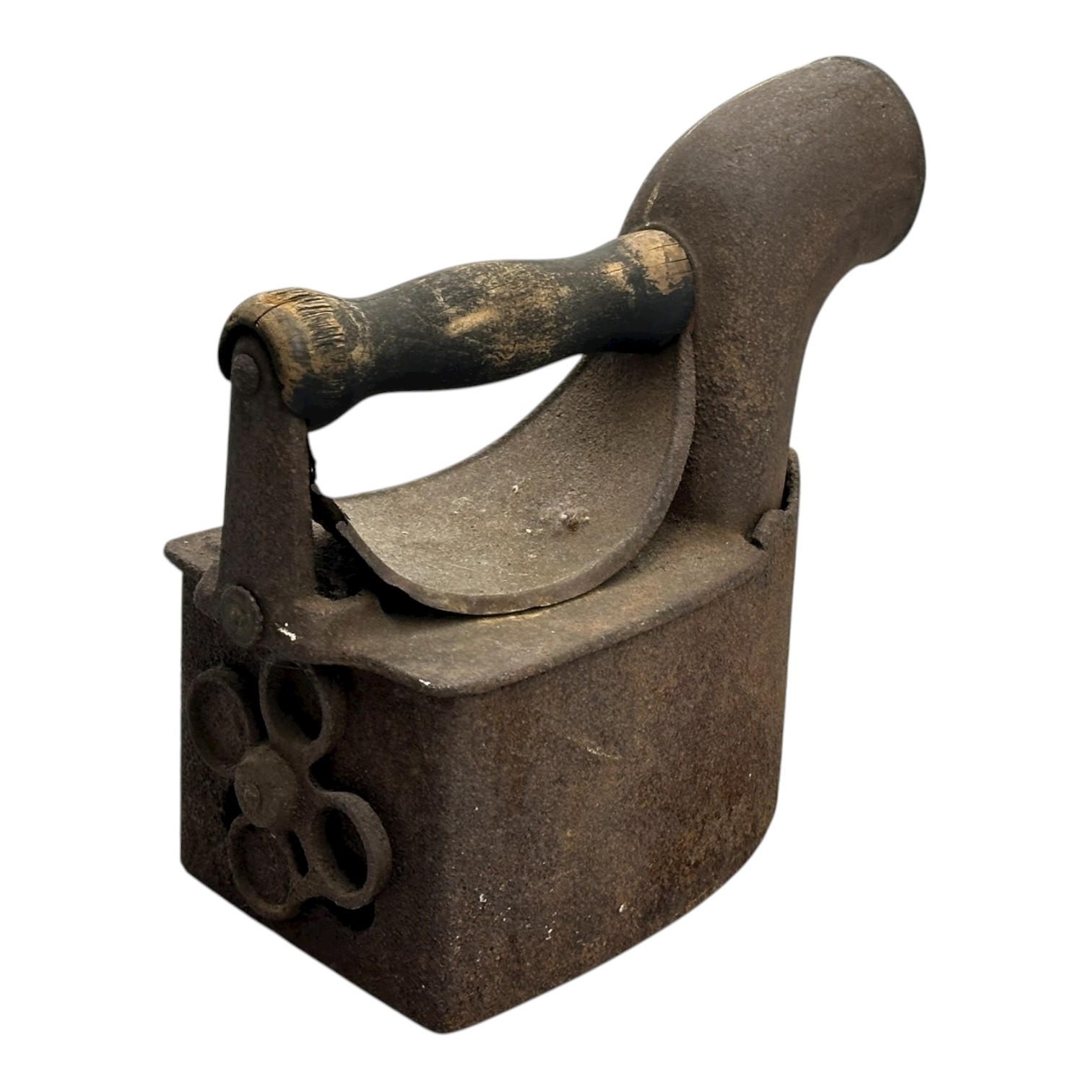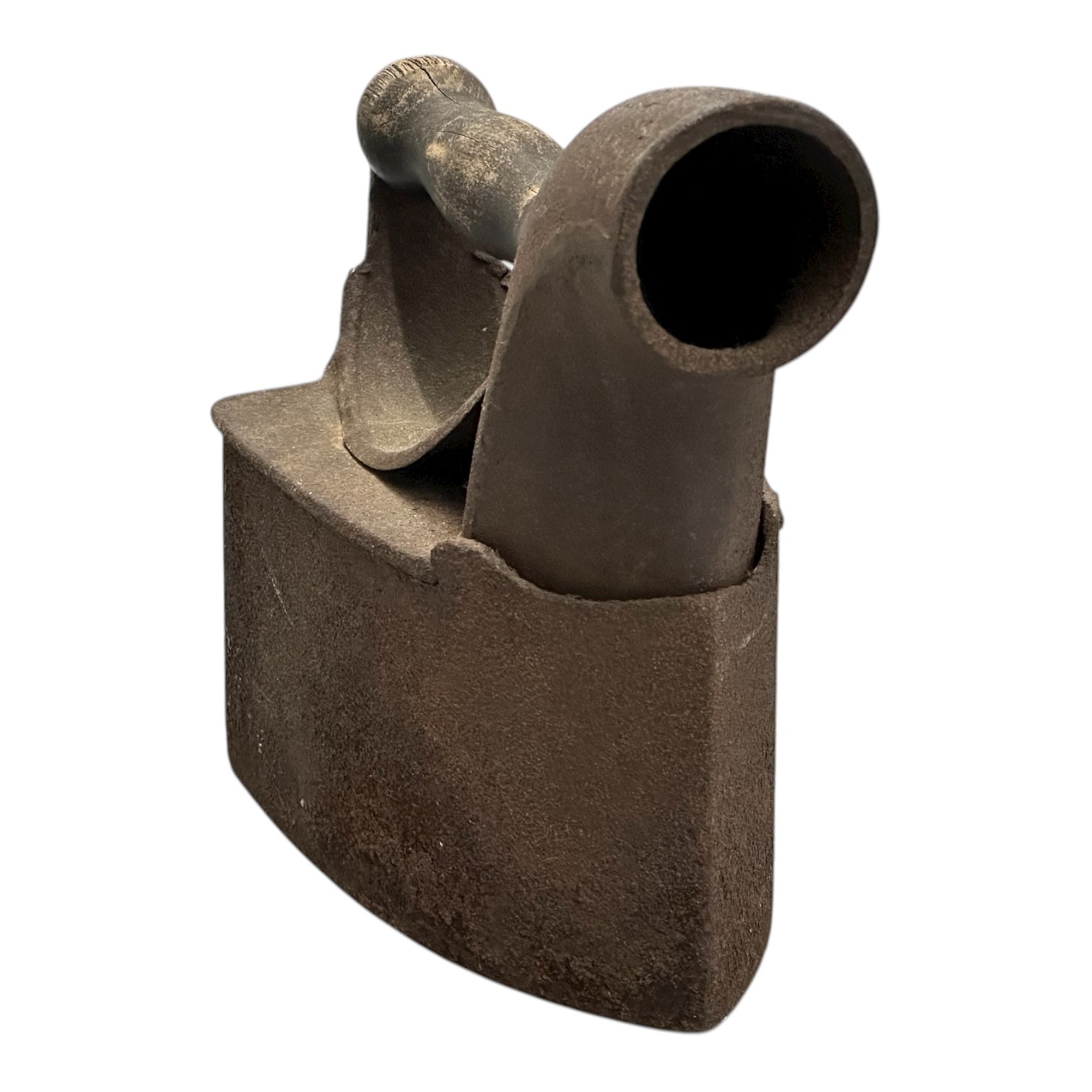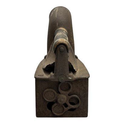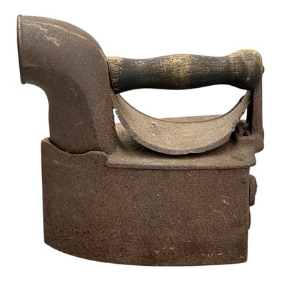 Antique Late 19th C. Charcoal Clothes Iron. Wood Handle, Cast Iron Construction. 7" x 8.25" x 4". Oxidized patina consistent with age and use. Nice display piece.