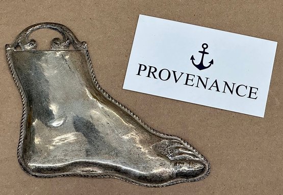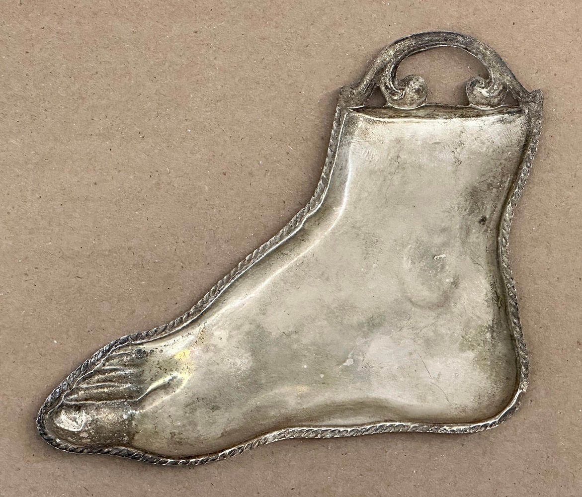 Antique Silver Catholic Italian Ex-Voto Foot. Circa Late 19th/ Early 20th C. These would be left at holy sites and places of worship as offerings to saints to represent a prayer for a miracle pertaining to a particular ailment. 4.25" x 4.635"
