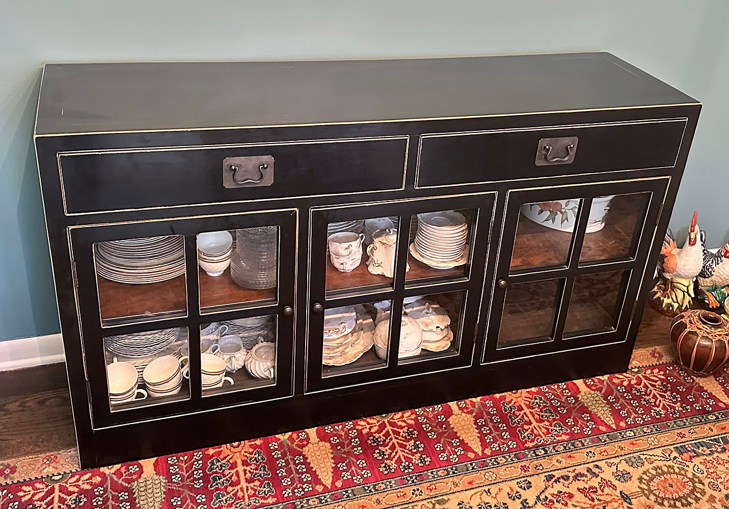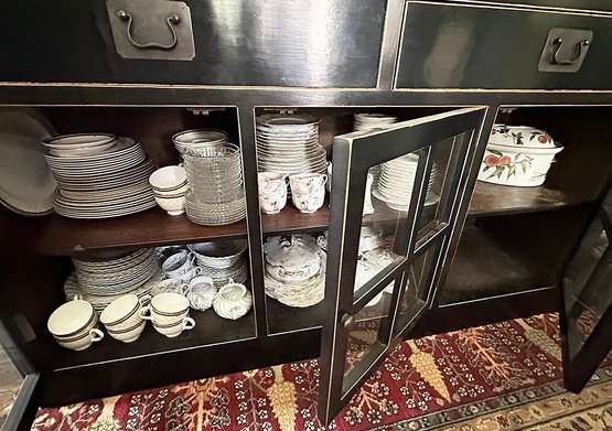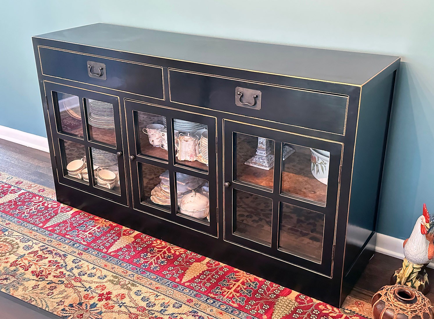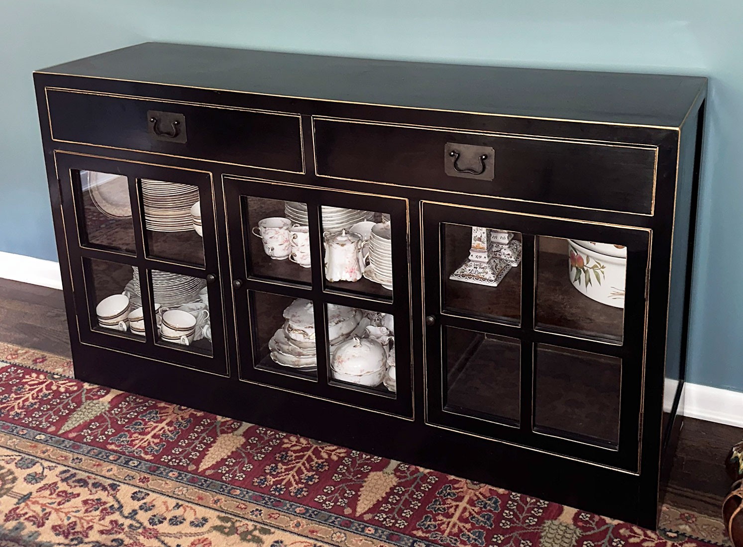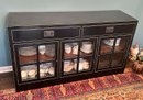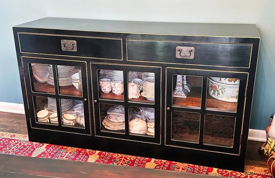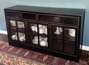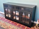Asian Style Ebonized Wooden Buffet. Attributed To Christian Audigier. Unmarked. In Good/Very Good Condition. 63" wide, 17.5"d x 35.5"h