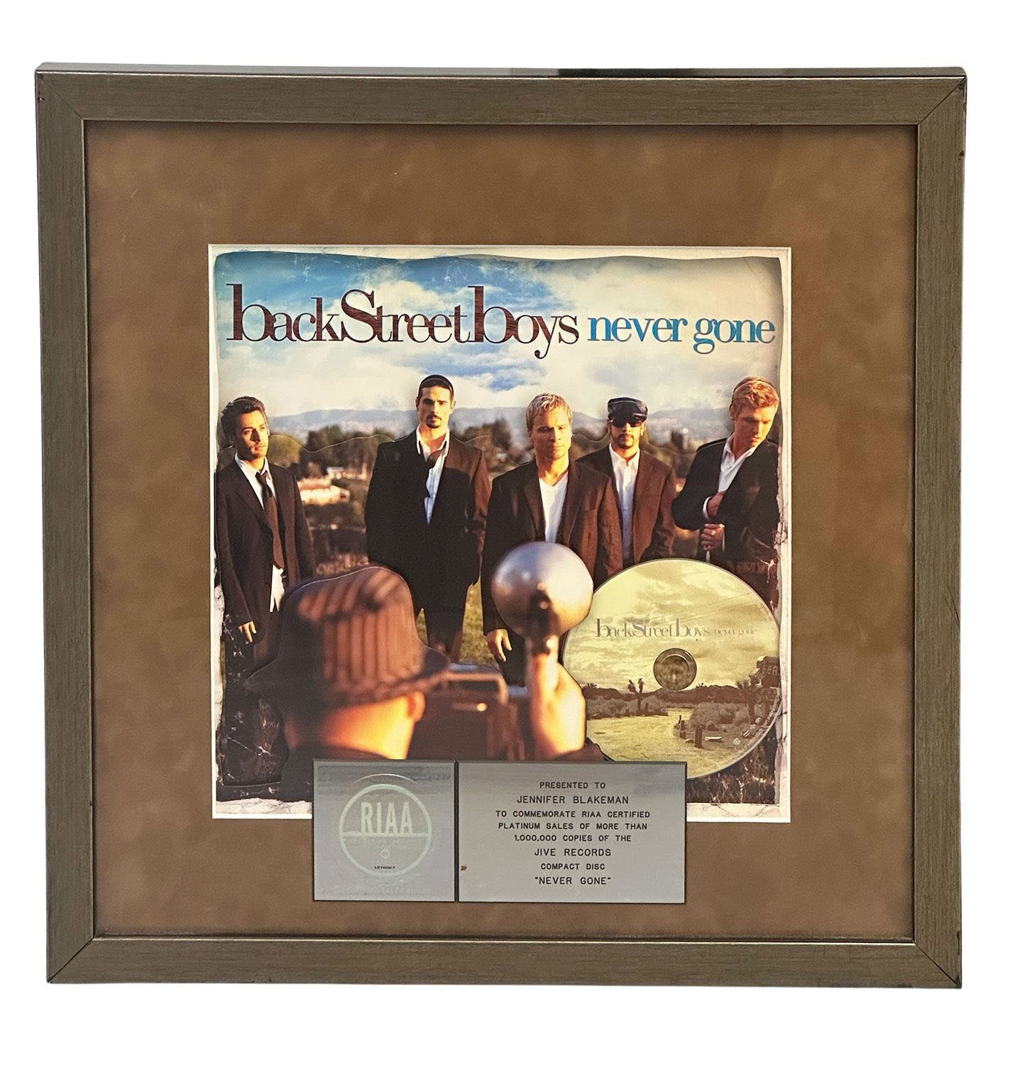 Authentic Backstreet Boys Platinum Record Award For Their 2005 Album "Never Gone". This was awarded to a music executive. This is an official Platinum Record award and not an mass produced aftermarket piece. 18.75" x 19"