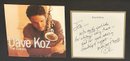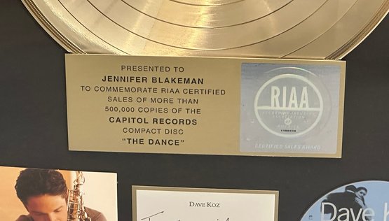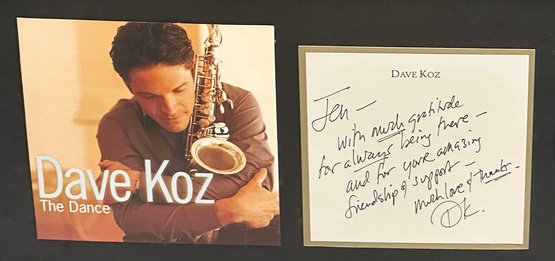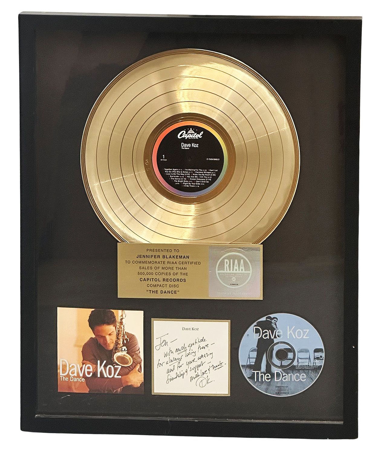 Authentic Dave Koz Gold Record Award For His 1999 Album "The Dance". Includes a personal handwritten note to the executive from Dave Koz. This was awarded to a music executive. This is an official Gold Record award and not an mass produced aftermarket piece. 18.25" x 28.75"