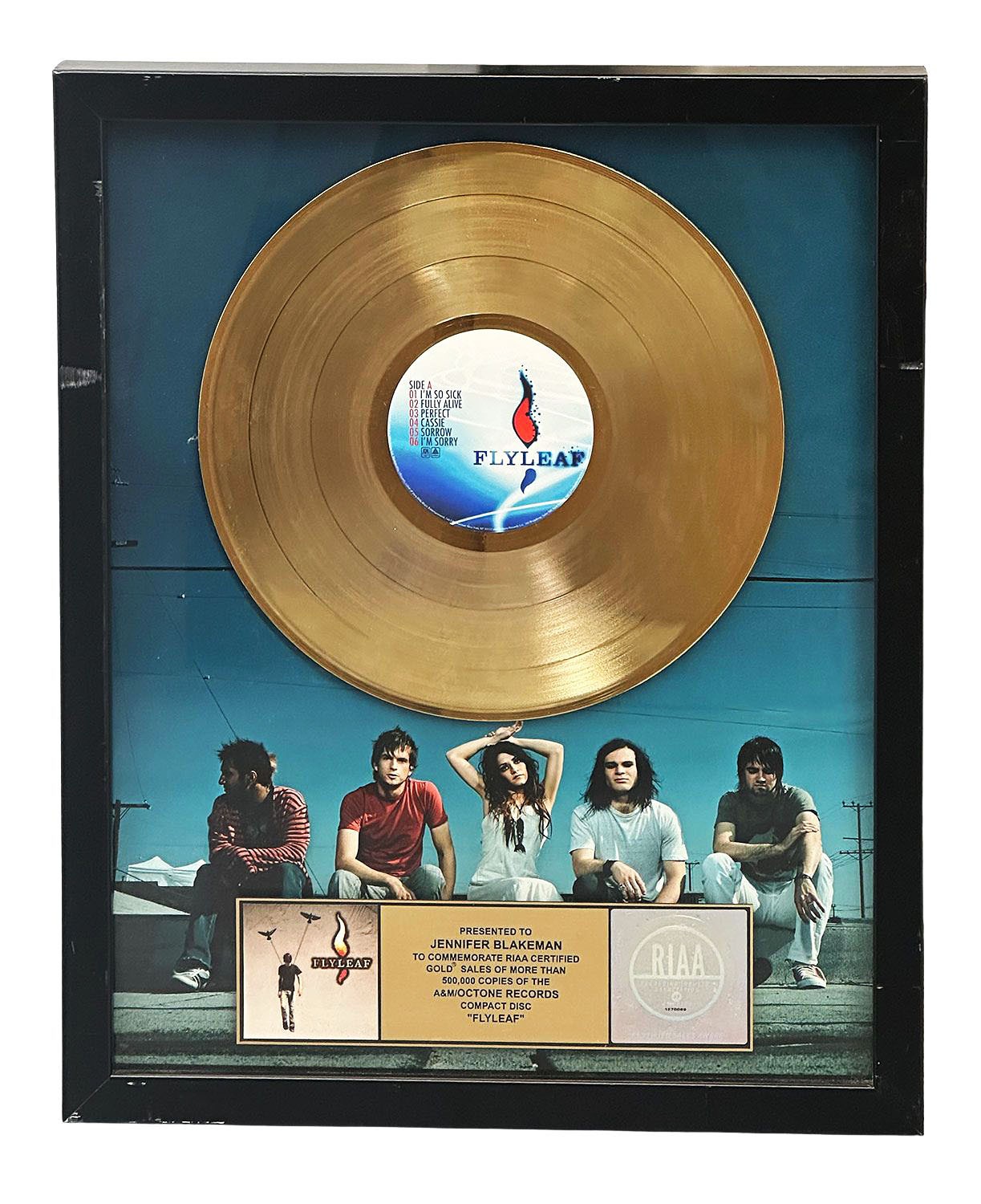Authentic Flyleaf Band Gold Record Award For Their 2005 Album "Flyleaf". This was awarded to a music executive. This is an official Gold Record award and not an mass produced aftermarket piece. 17.5" x 21.5".