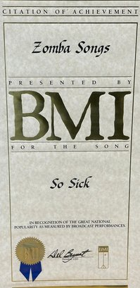 Authentic Pair Of BMI Citations Of Achievement - Ne-Yo "So Sick" (2006) - R&B. Each award is 10" x 20". With the printed signature of BMI President and CEO in black ink. Comes in original plastic sleeve with cardboard backing.