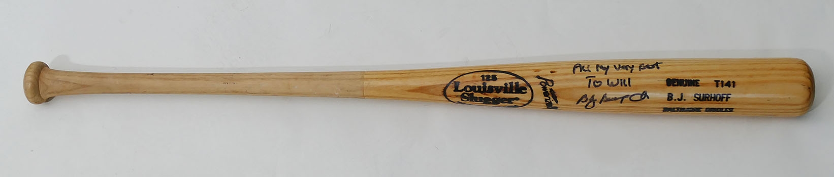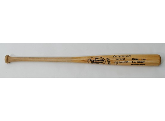 B. J. Surhoff MLB Signed Baseball Bat. Signed and dedicated in black marker. When he was playing with the Baltimore Orioles.
