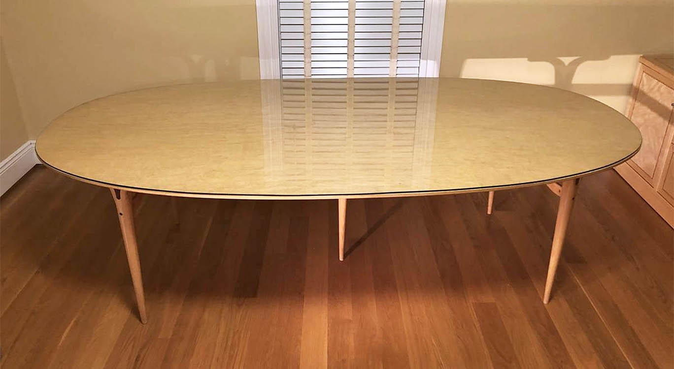 Beautiful Bruno Mathsson (Sweden) Birch Burl Oval Dining Table With Cleft Legs. Same design and construction since 1960. These are the original owners having purchased the table in Sweden and had a custom removeable glass top added that has protected the gorgeous birch burl veneer top. This table is in Excellent Condition and is an incredible example.