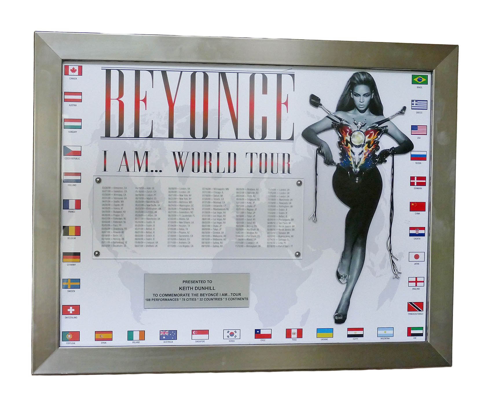 Beyonce "I AM.. World Tour" Framed Commemorative Display. Created by Ill Eagle Enterprises who designs and creates a majority of the gold and platinum album awards from the major record labels. Dedicated to Keith Dunhill, who at the time was in a business and personal relationship with Thierry Mugler, who designed the outfits for Beyonce's toru including the famous motorcycle top shown in the display. In a metal frame.