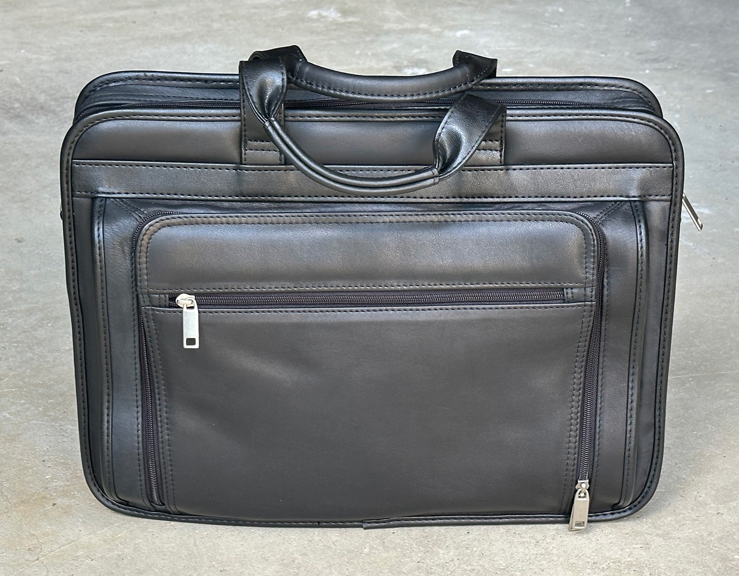 Black Leather Briefcase / Laptop / Messenger Bag. With Handles & Shoulder Strap. Also include a leather notebook and wallets. 17" x 6" x 13". Brand New in the Factory Bag.