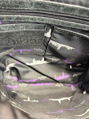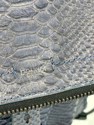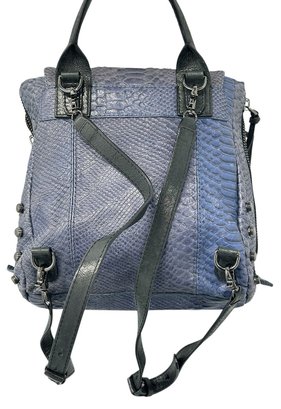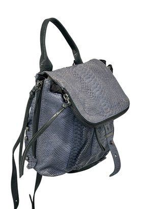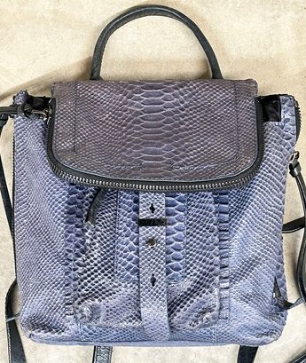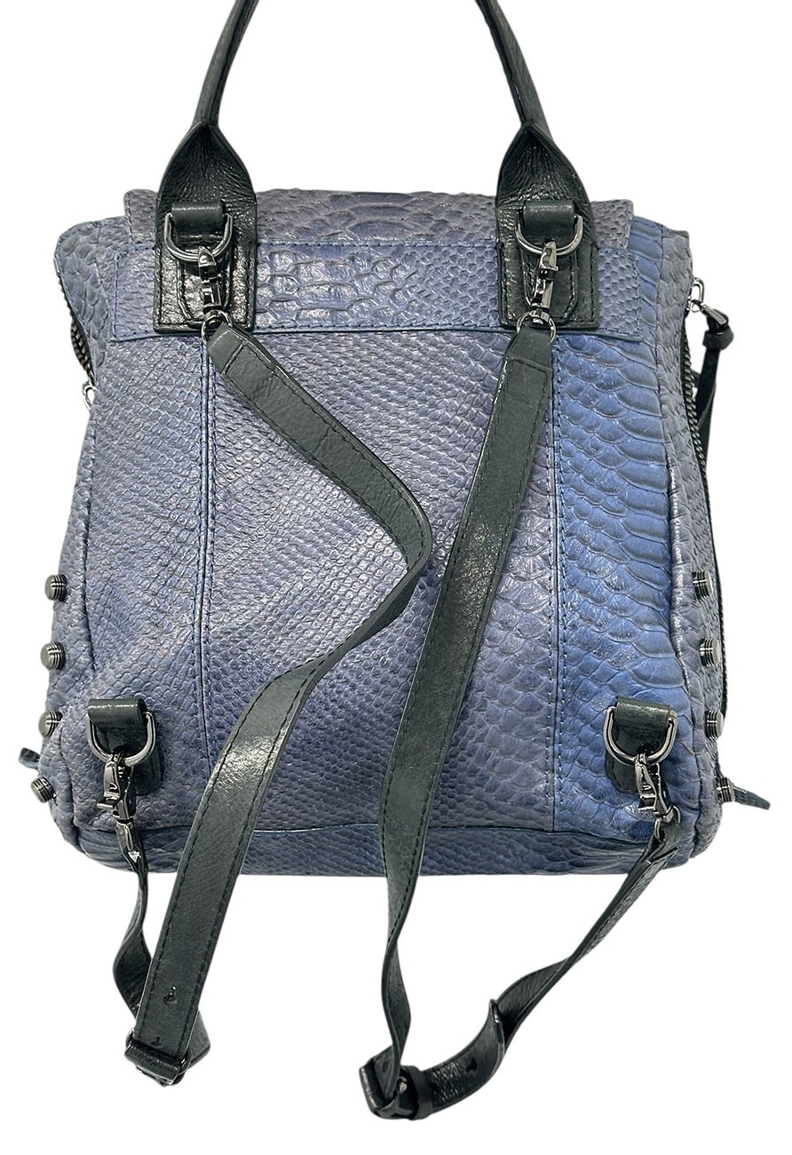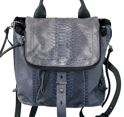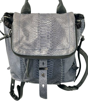 Botkier Warren Leather Python-Embossed Backpack. Blue textured leather backpack with polished hardware. Front slip pocket and internal zip pocket and multifunctional slip pockets. In Good Condition. 13"H x 13W x 5.5"D. MSRP - $498