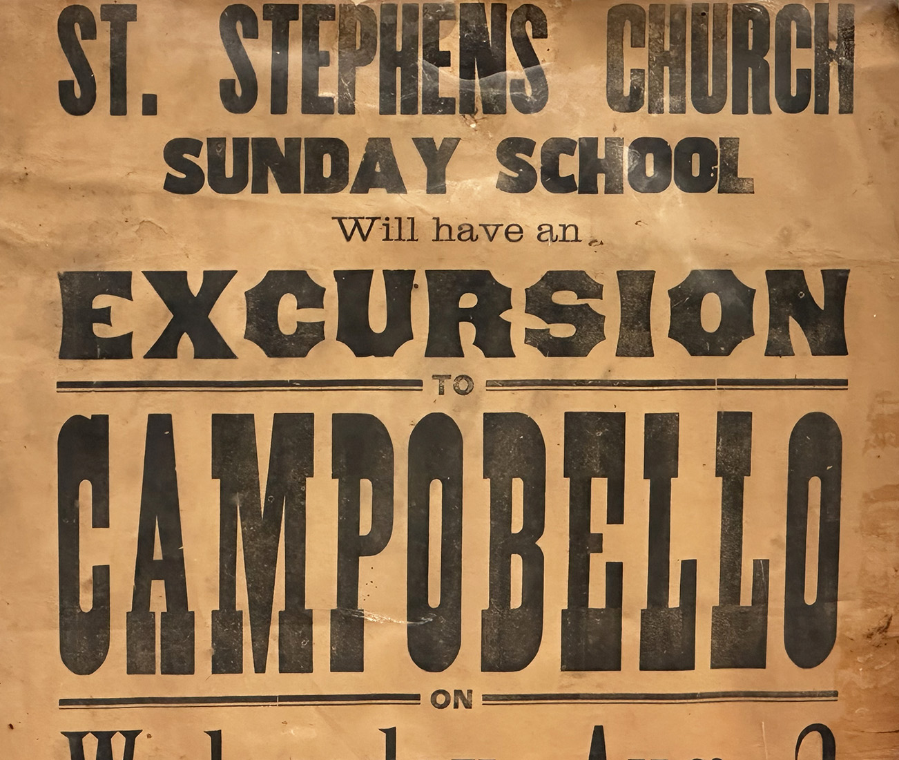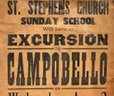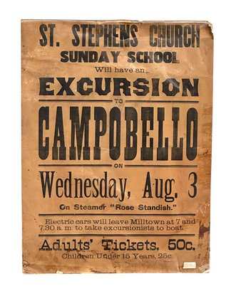Original Poster - St. Stephen's Church (Boston) Excursion To Campobello On The Steamship Rose Standish. Circa 1910's-1920's. Mounted to board and wrapped in plastic. Some wear and tear. Nice display. 14.25" x 19.5"