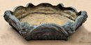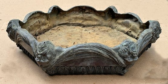 Cast Iron Planter Base / Tray. With carved upside down faces. 14" x 13" x 4". In good condition.