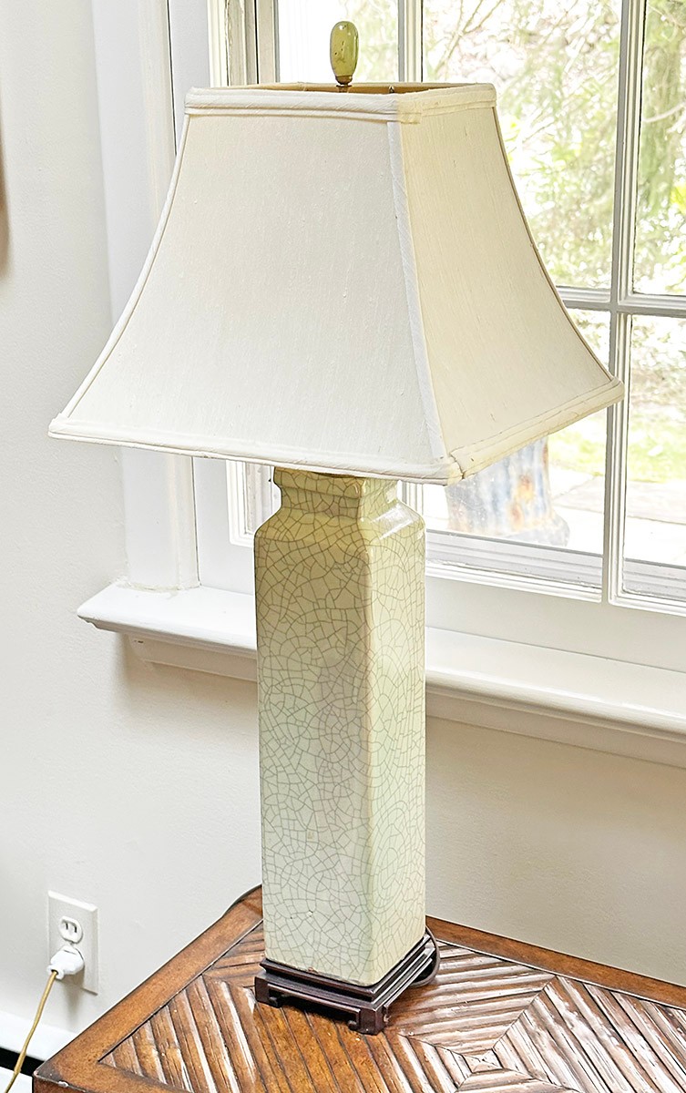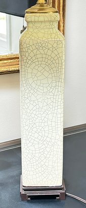 Ceramic Craquelure Table Lamp. With white shade and jade colored finial. In Good Condition. 12" x 12" x 31"h