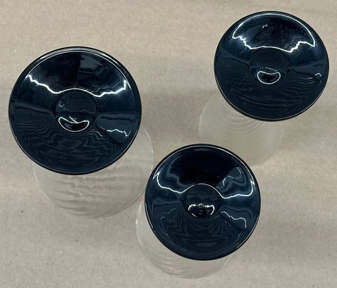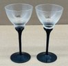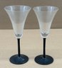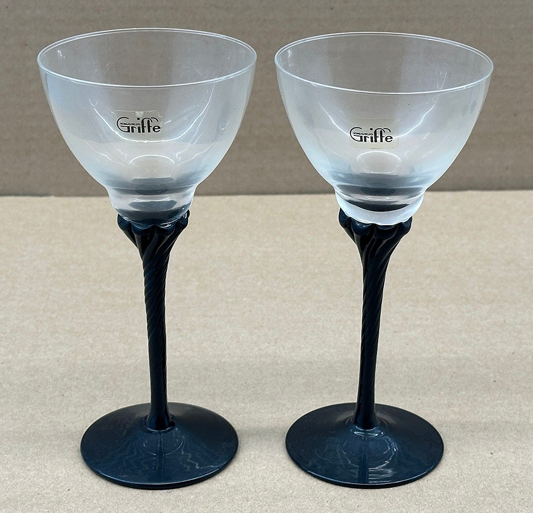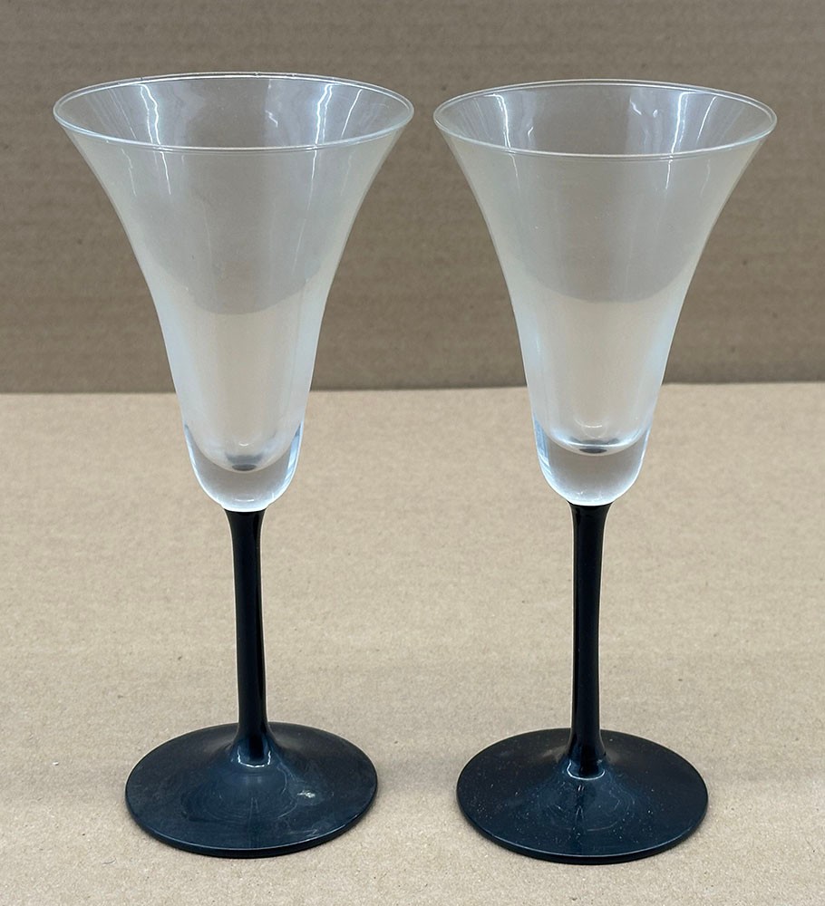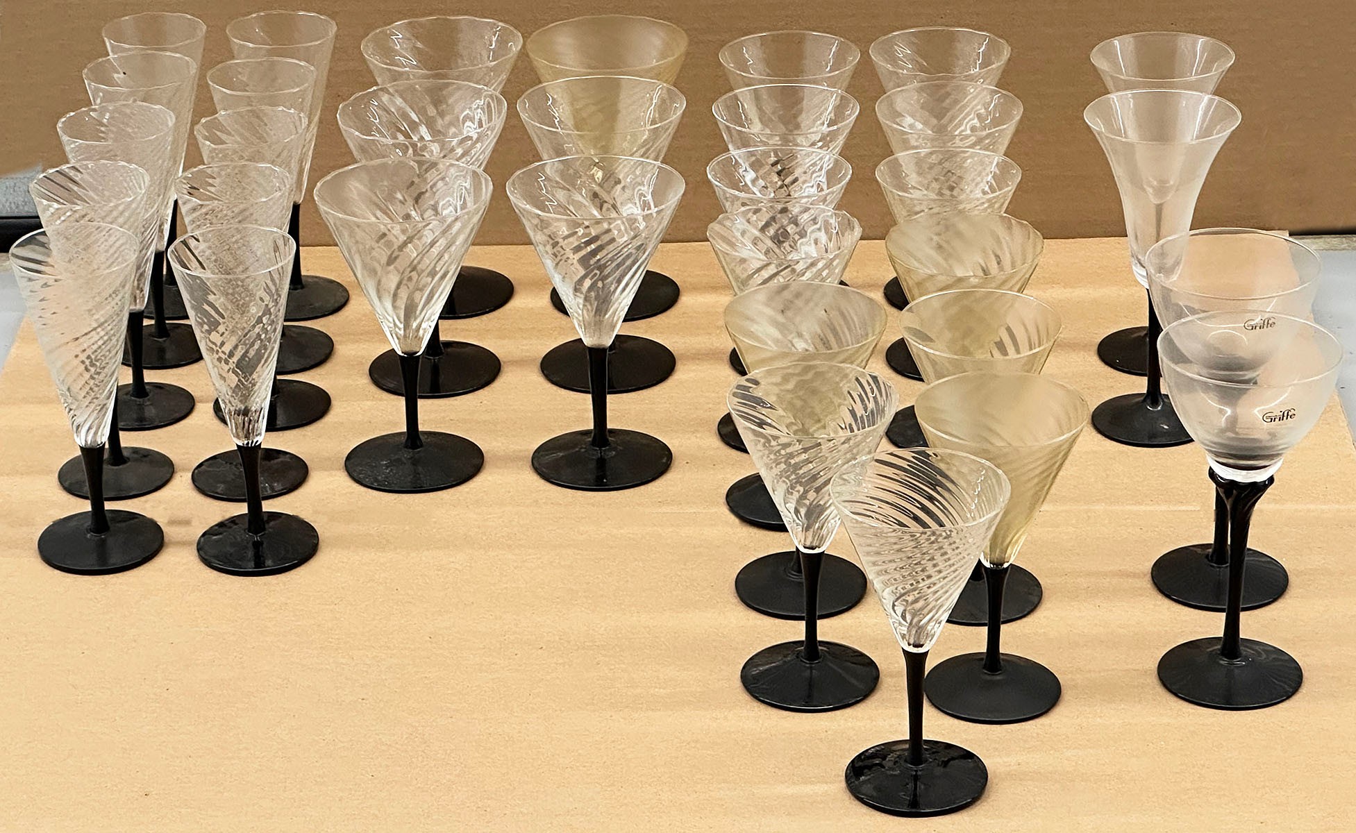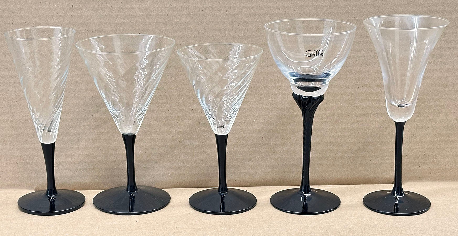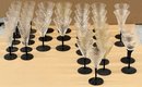 Champagne & Wine Glasses/Flutes (37). With Black Stems. 33 Glasses are the same brand with a swirl pattern, unmarked. Includes 10 -7.25" flutes, 6 - 6.875" wine, and 13 - 6.5" wine. There is also a pair of Griffe wine glasses (7.675") and an unmarked pair of wine glasses (7.75"). In good condition with storage dirt/dust; they will clean up nicely.