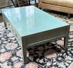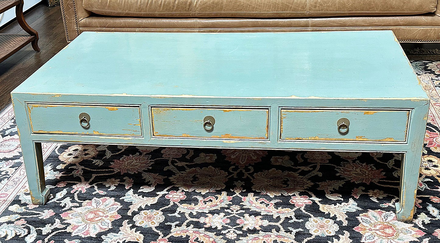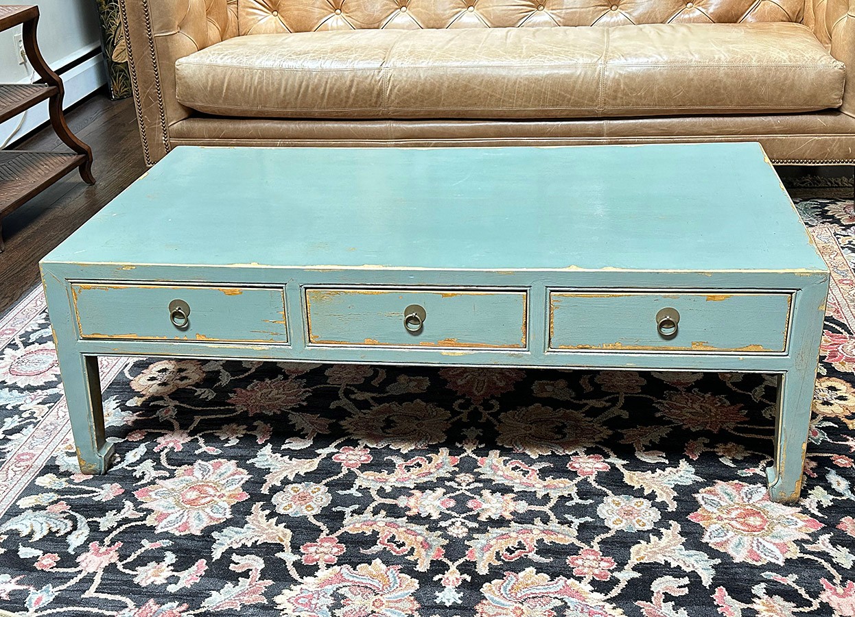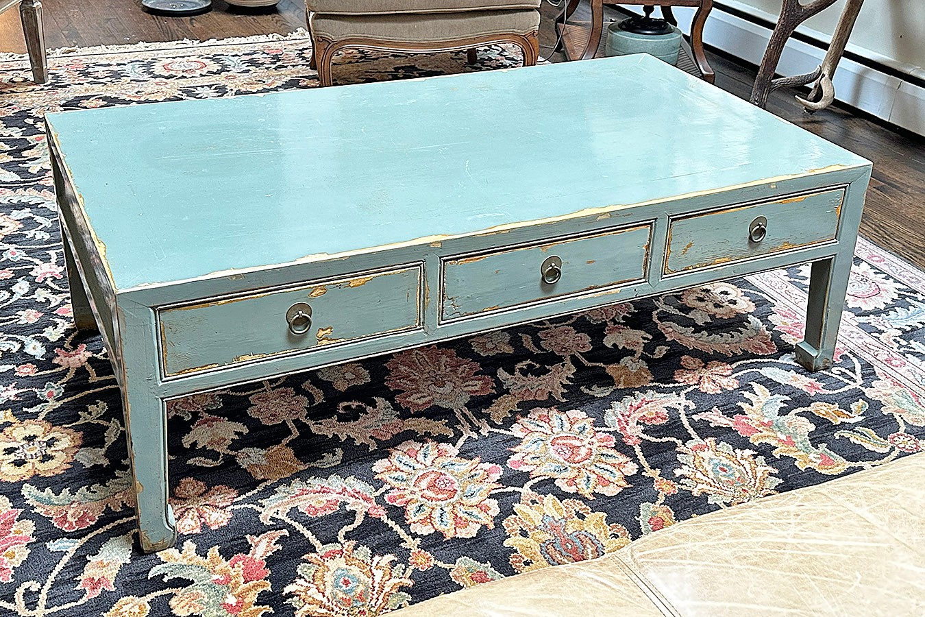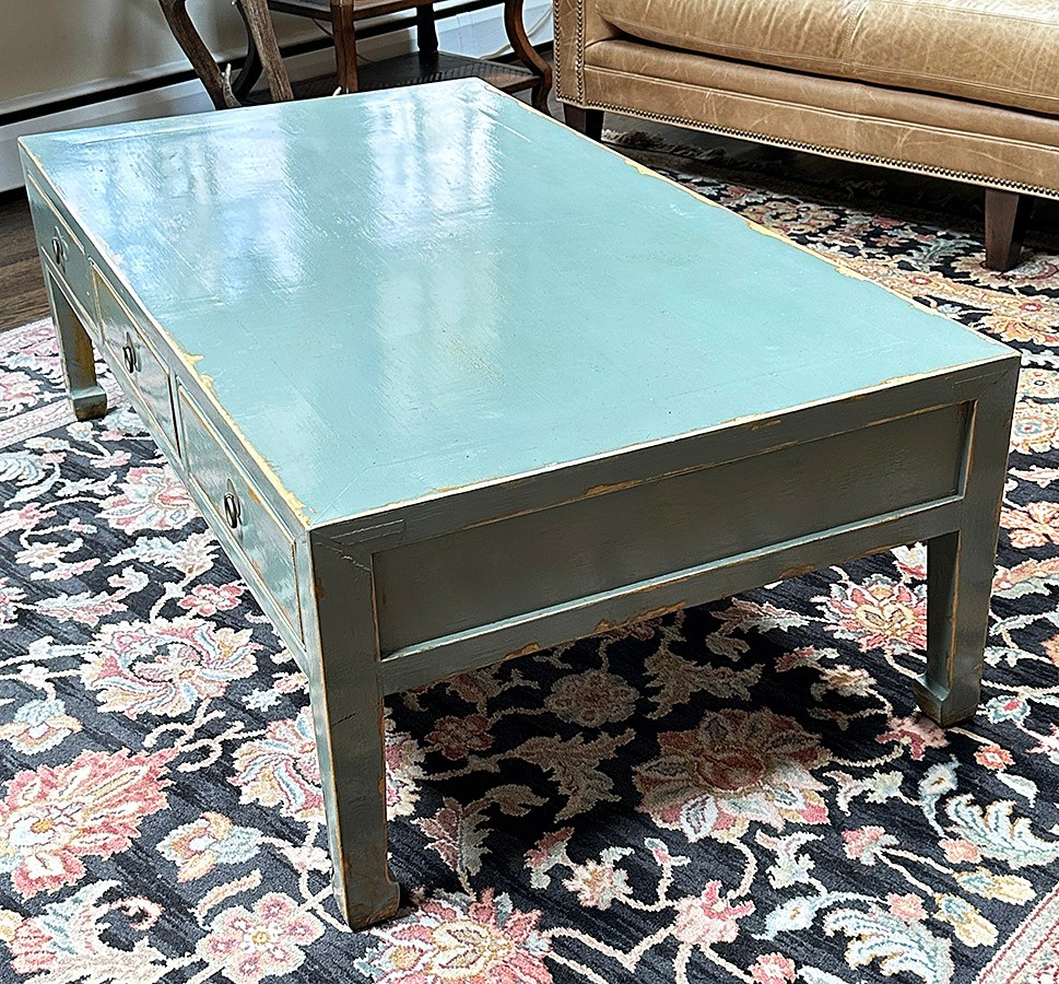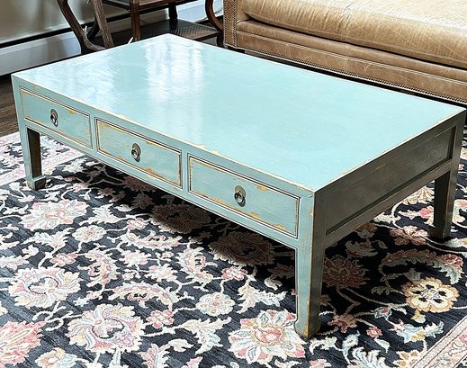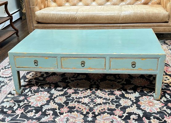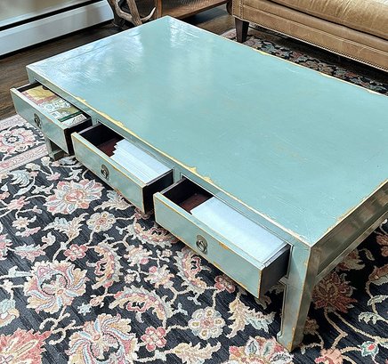 Chic Distressed Wooden Coffee Table. With three drawers on each side. In good condition. 53.5" x 30" x 18.5"h.