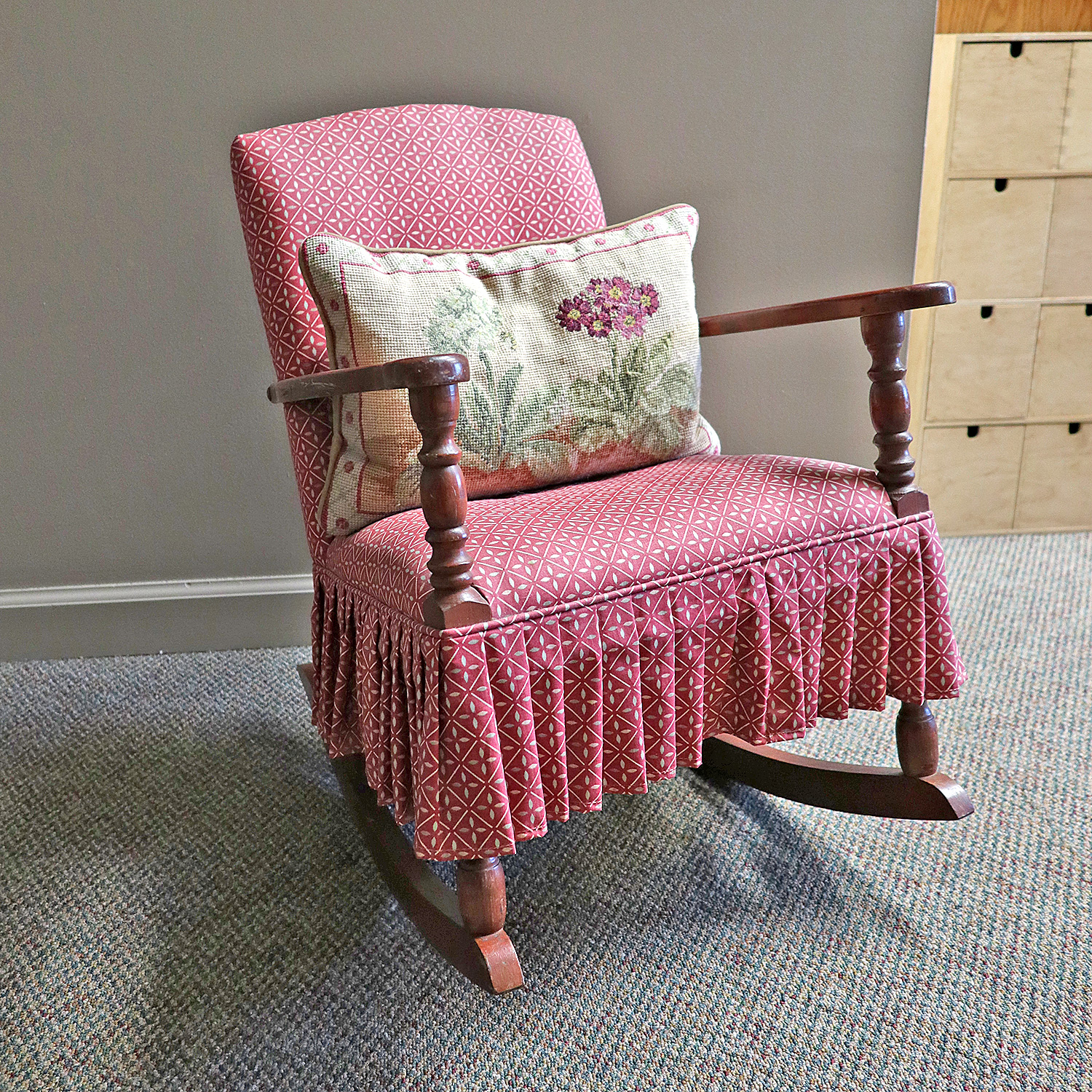 Child's Upholstered Rocking Chair. Turned wooden arms. 33"h x 30"w x 27d. Some marks.