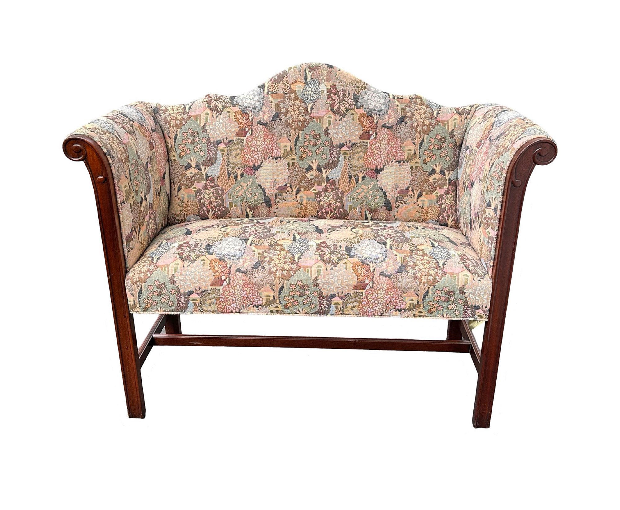 Chippendale Style Upholstered Settee From Southland Furniture (N.C.). In Good/Very Good Condition. Beautiful upholstery pattern. Narrow footprint to fit in most settings. 43"long x 17.5"deep x 35"high