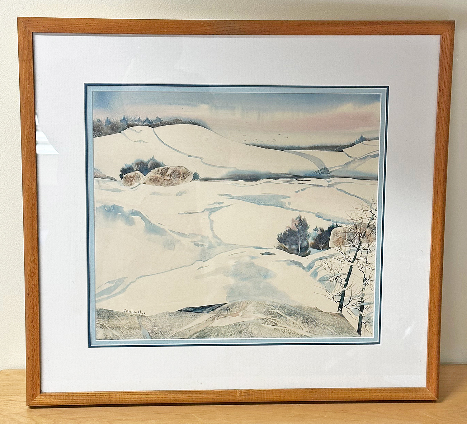 Christine York Original Watercolor Painting - Winter Landscape. Framed. 20" x 22". In Very Good Condition. Artist Bio on the back.