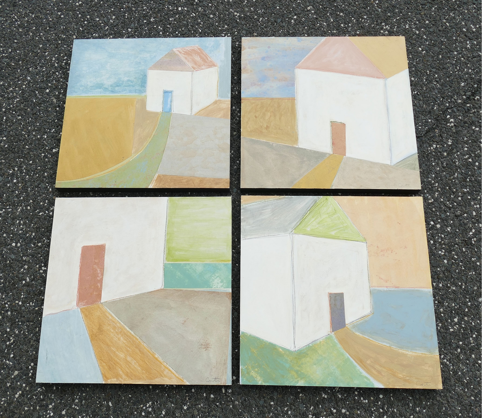 Collection Of 4 Original Paintings - Geometric House & Landscape. On board. Signed Carter. Each piece measures: 21" x 21" x 1.5". All are in Good/Very Good Condition.