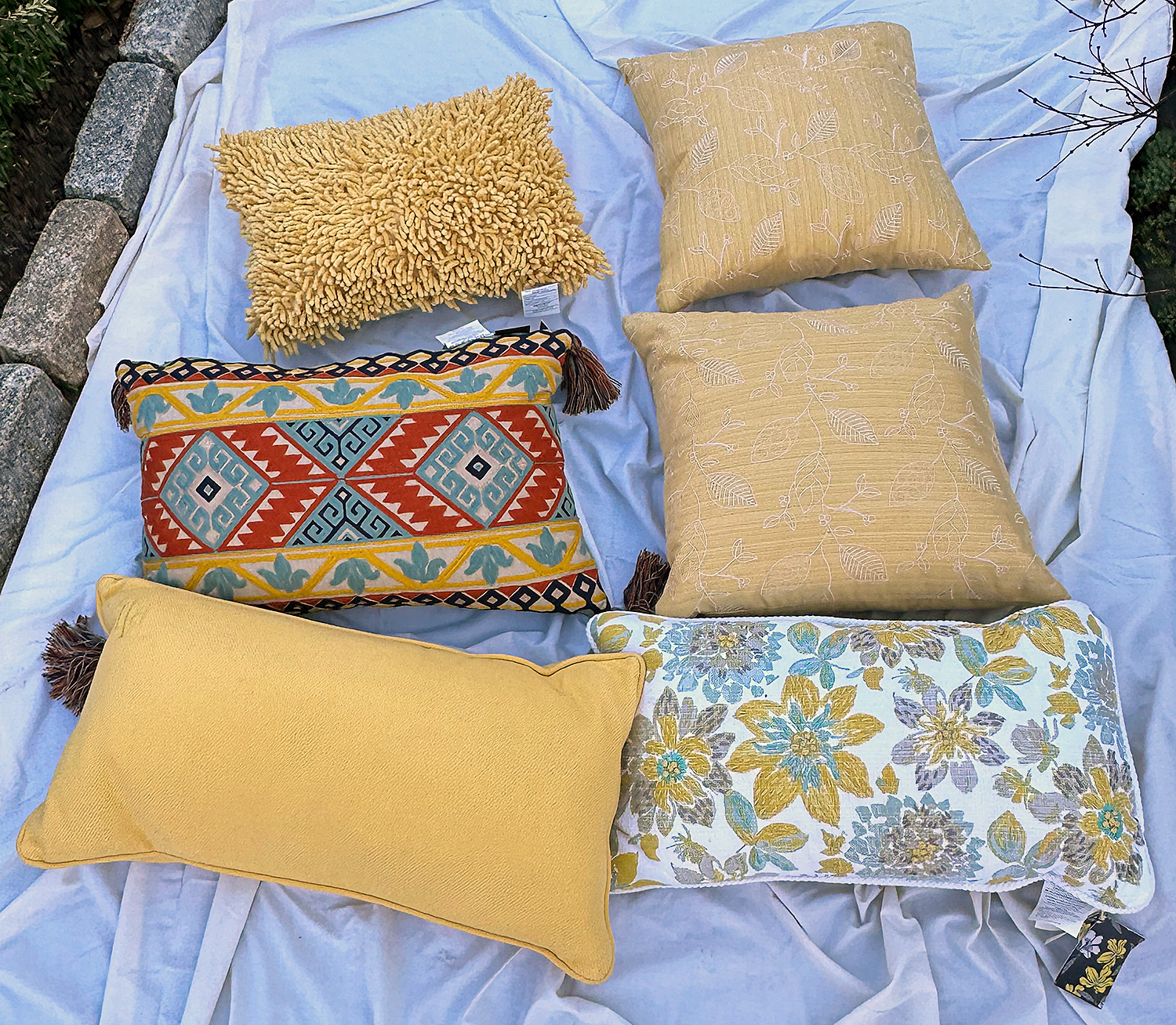 Collection of 6 Unused Throw Pillows. Excellent, some with tags. The white floral pillow measures 14" x 24".