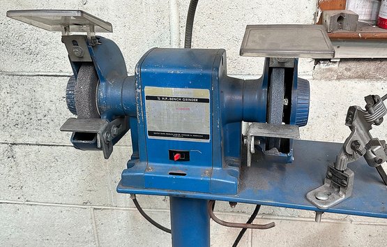 Craftsman 3/4HP Bench Grinder W/ Drill Bit Grinder Attachment Sharpener. Attached to a matching blue floor stand.