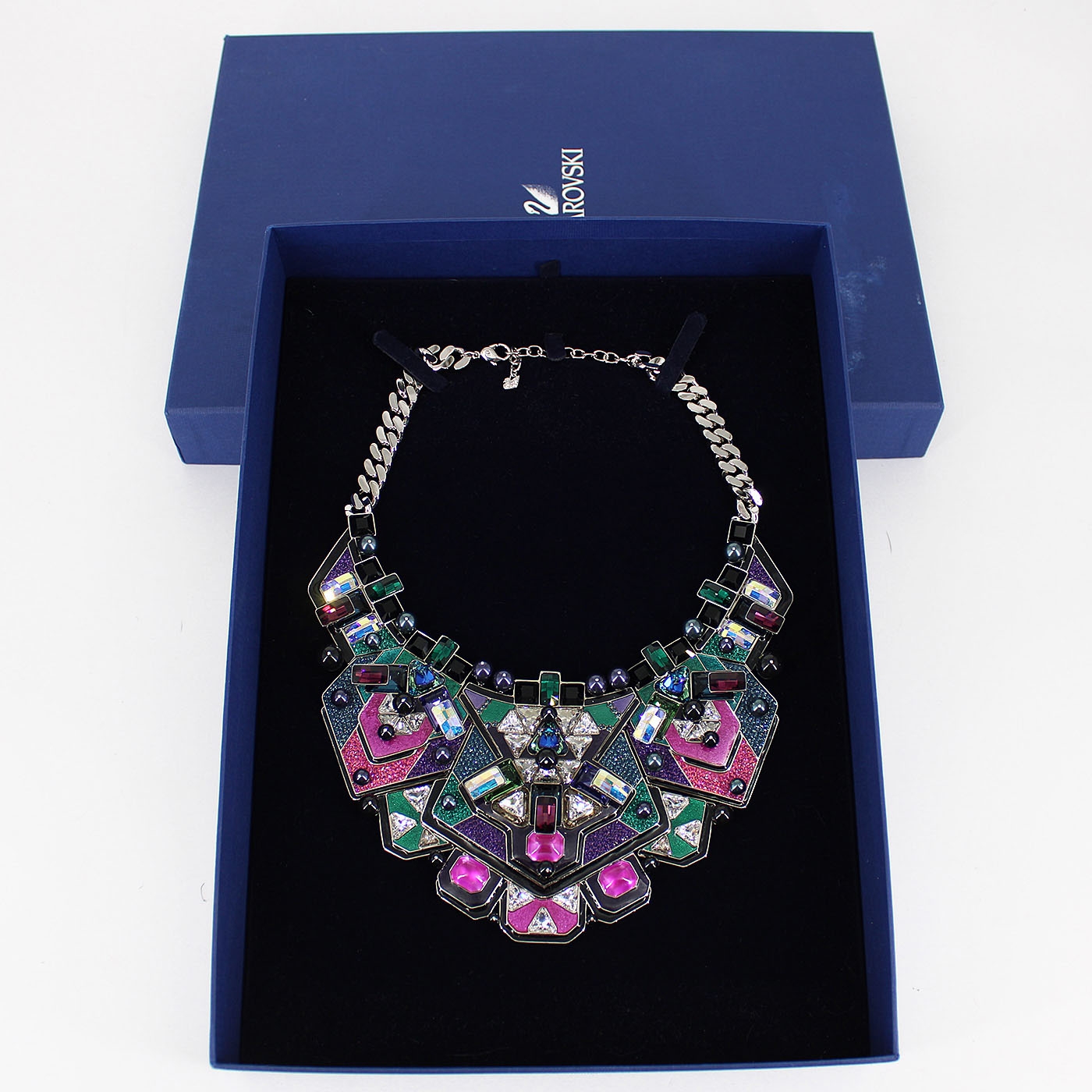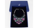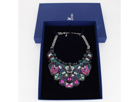 Authentic Swarovski Crystal Geometric Statement Necklace. From the 2014 "Buzz" Collection, this Swarovski necklace features incredible crystal embroidery applied by hand using the Pointiage® technique with opulent crystals that produce a modern 3D effect. This striking necklace turns heads with its futuristic and original design. Palladium-plated chain. Marked with the Swan logo on necklace and chain.