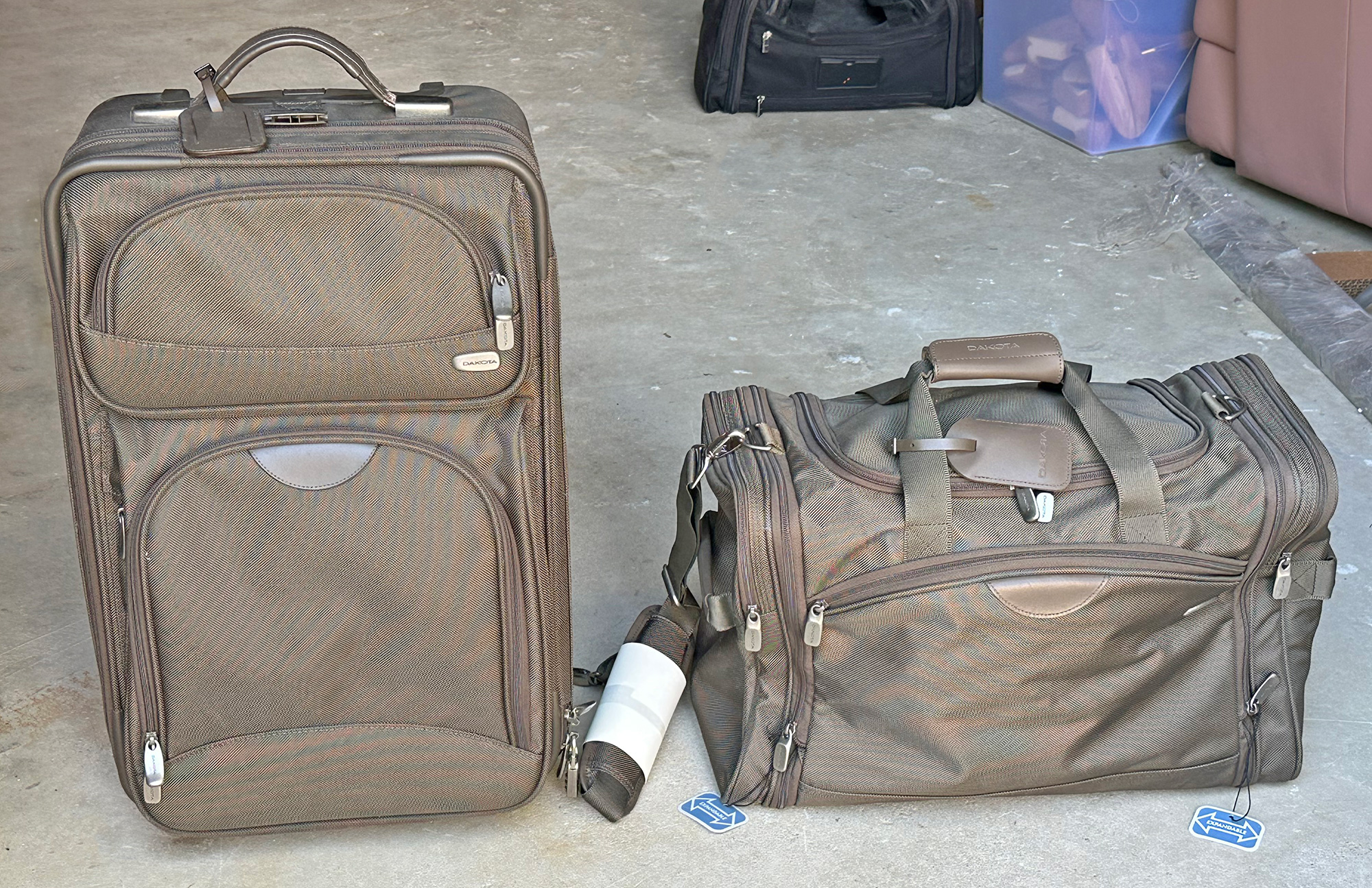 New, Never Used - Dakota Luggage Set. Includes a Telescoping Handled Rolling Suitcase (24" x 14" x 10") & Duffel Bag (20" x 10" x 15"). The Duffel still has the tags attached. Cost $350.