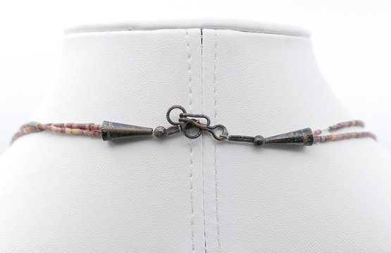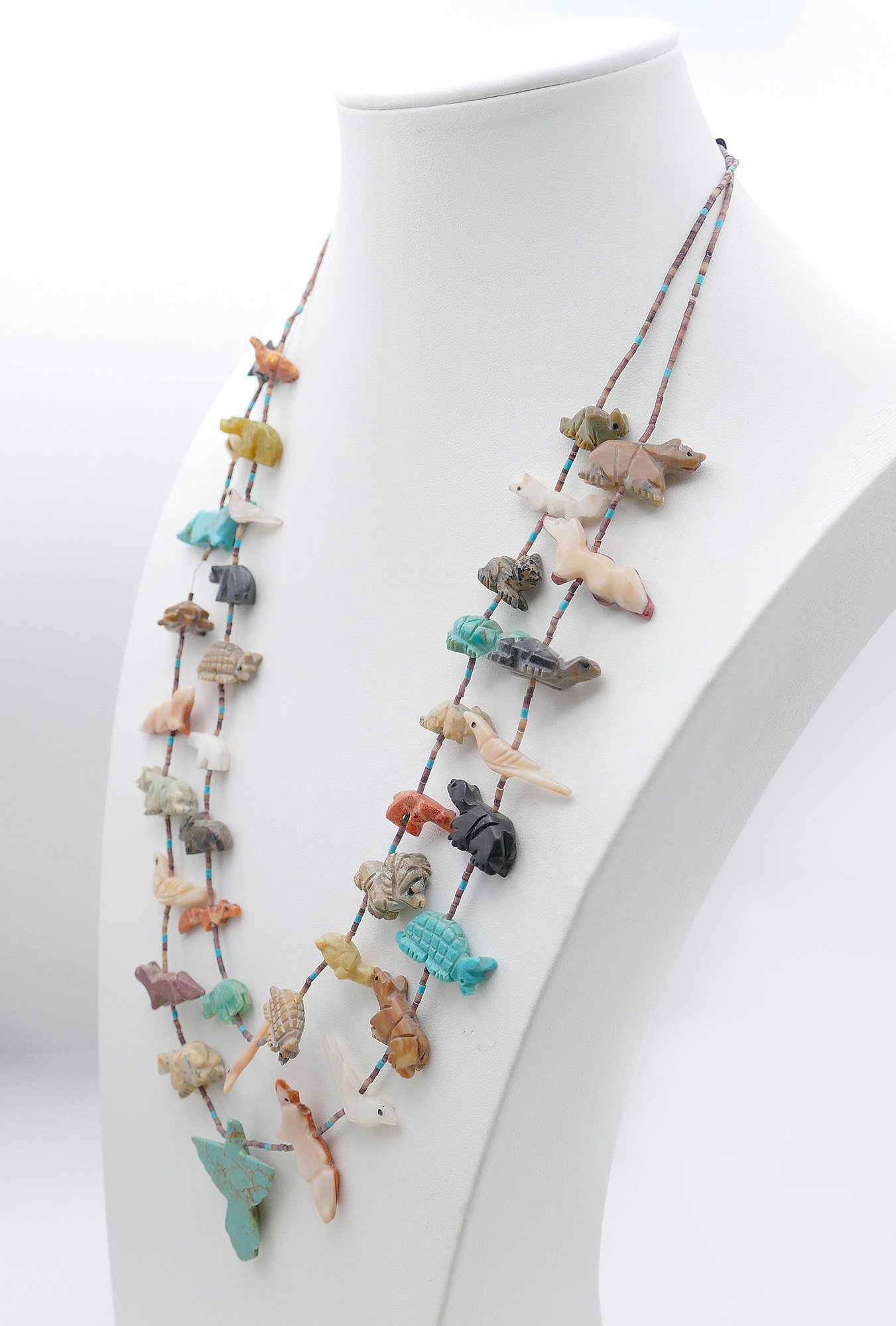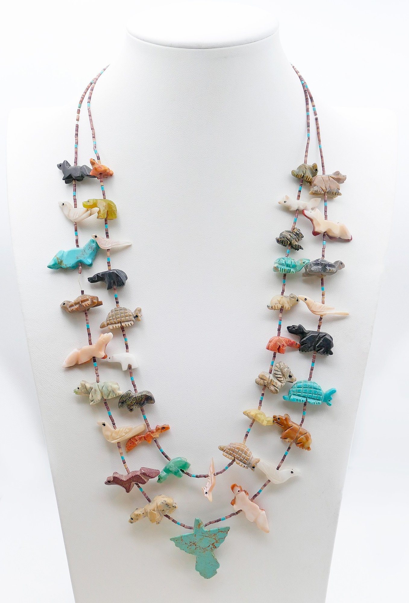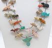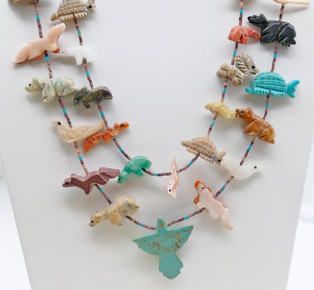 Double Strand Native American Bird Fetish Necklace. Beads, Turquoise, and Natural Stone. Nice selection of different carved animals. In Very Good Condition. 26" long.