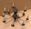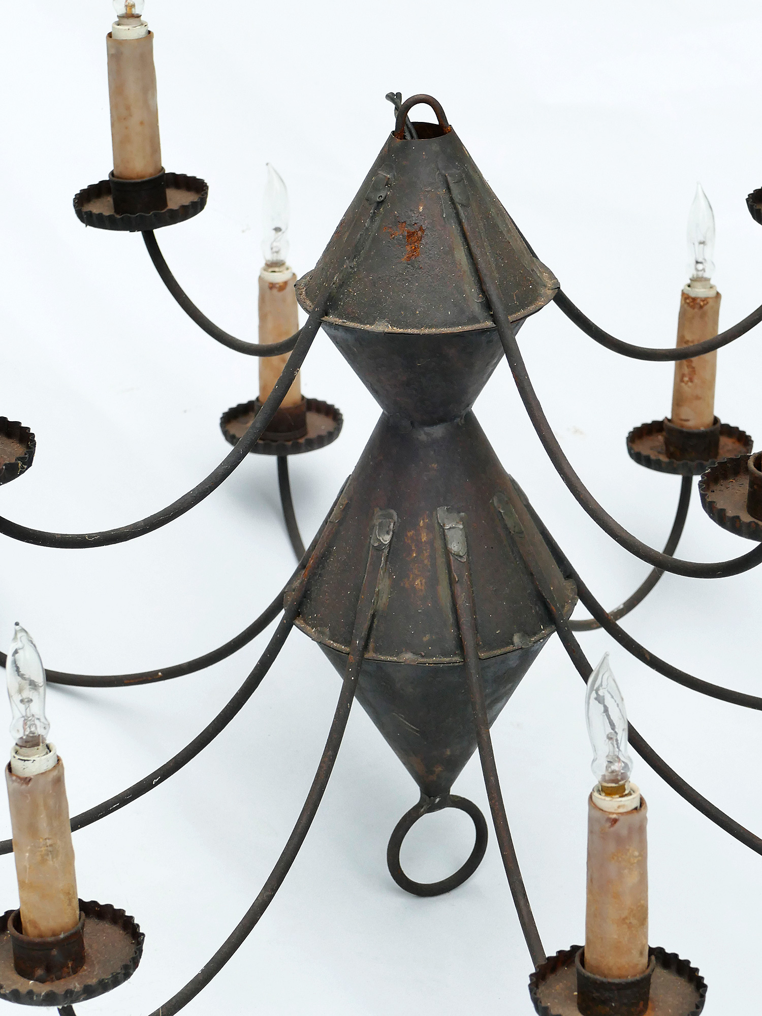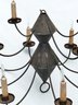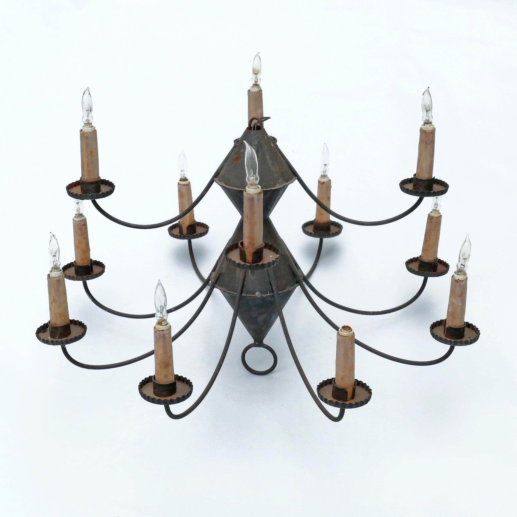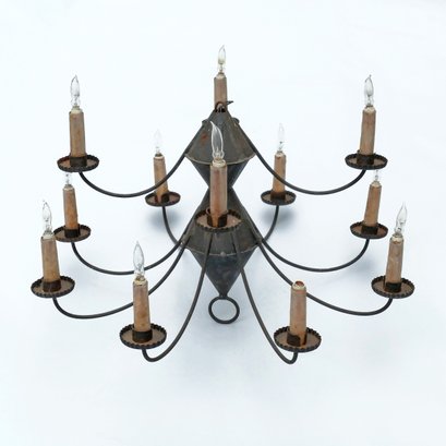 Early American Tole 10-Arm Chandelier - Electrified. I was told that this was in working condition but we have no way of testing. Some rusting and it probably needs new light bulb and candle sleeves. Would look amazing with a new coat of paint. 27" diameter, 21" tall.