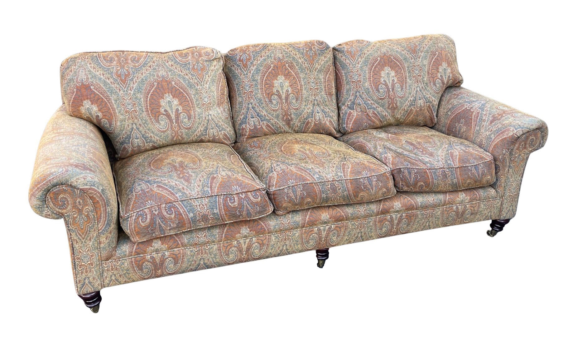 George Smith (England) 90" CBK Elverdon Upholstered Sofa. Made for the famed interior designer, Joszi Meskan. In good condition. On brass casters. Original Cost was approximately $15000.