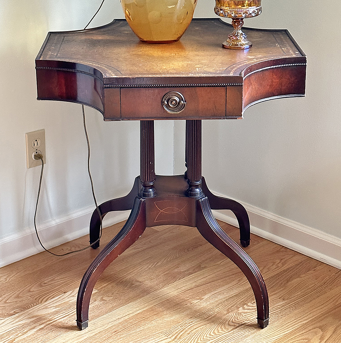 Georgian Style Card Mahogany Drum / Side Table with Leather Top. Some marks and stains on the leather. 25.5" x 26.5" x 28.5"H.