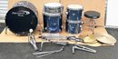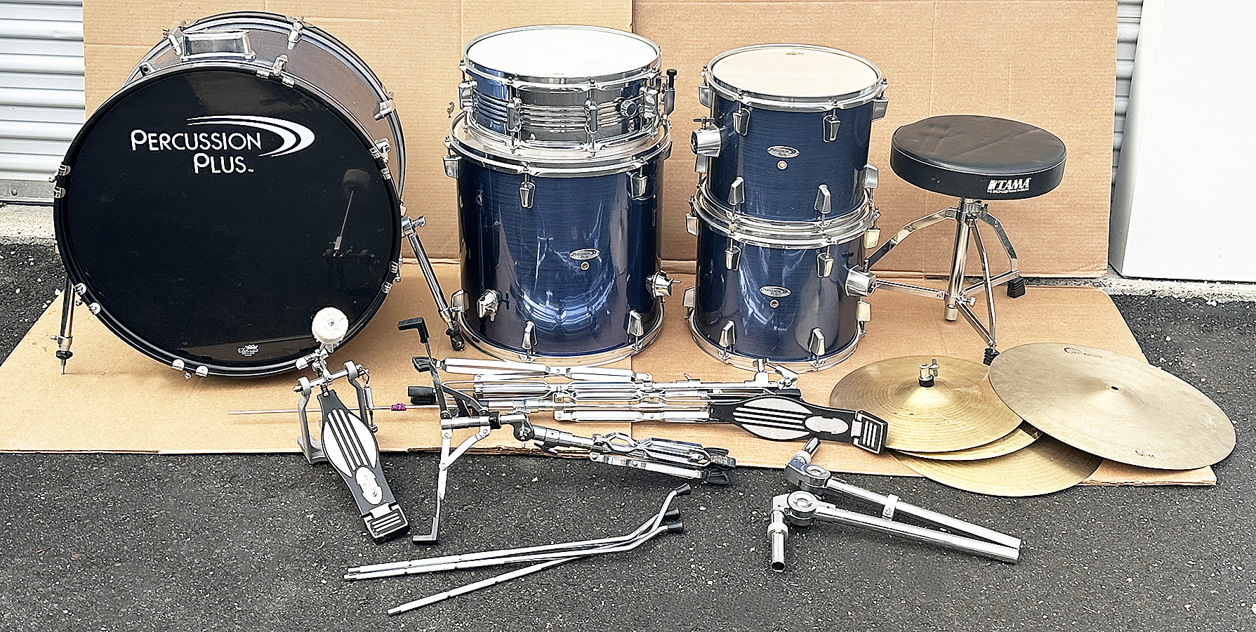 Percussion Plus 5-Piece Drum Set - In Blue. The drums have Tama heads and look rarely used. 22" Kick Drum. Somes with stands, Cymbals, Bass Pedal, and Tama Stool. Great set for the beginner/intermediate drummer.