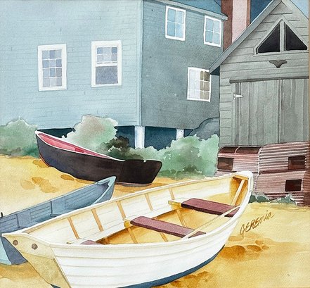 Geri Geremia (NY) Original Watercolor On Paper - Beach Scene. Framed/Matted. Painting is in Excellent Condition; frame is good with some marks. Framed Measurements: 21.25" x 21.5"