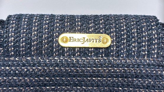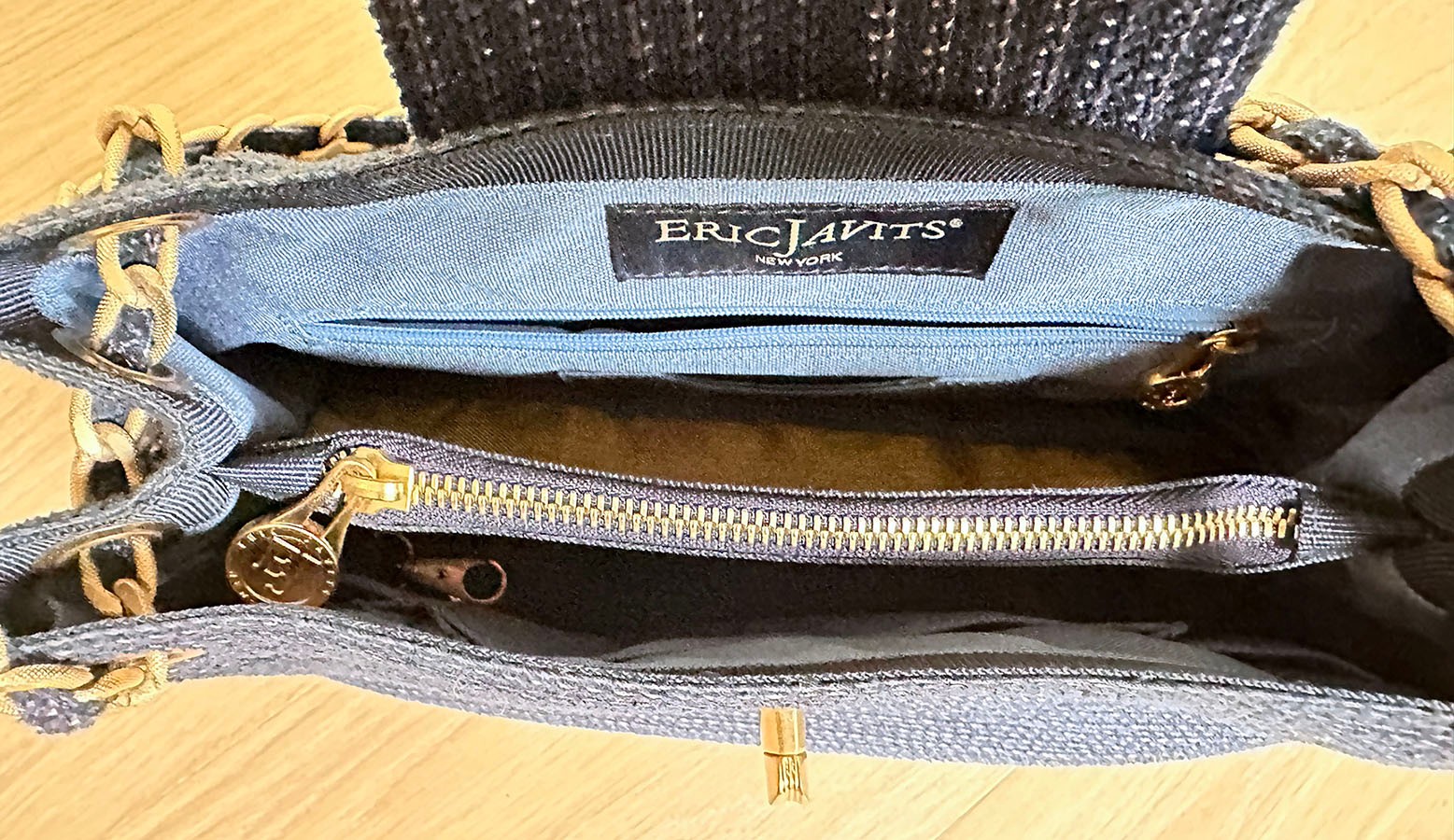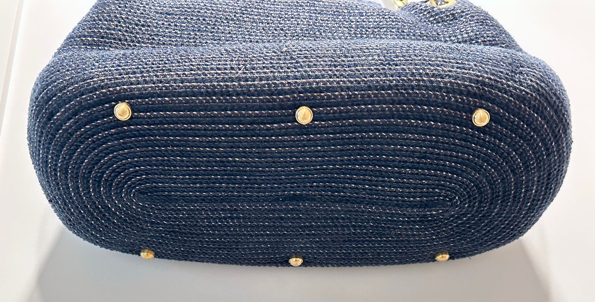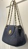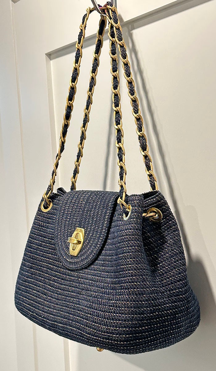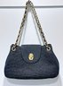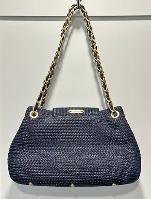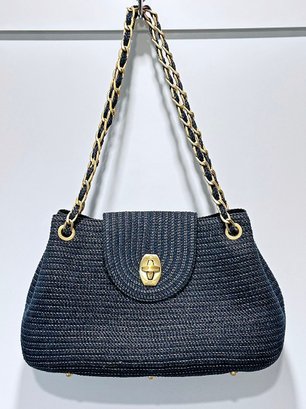 Eric Javits Woven Hand / Shoulder Bag. In blue with gold hardware and chain link strap. With twist closure. Can be worn as a handbag or shoulder bag. In Very Good Condition. 13" x 6" x 8" (bag), 10" Drop.