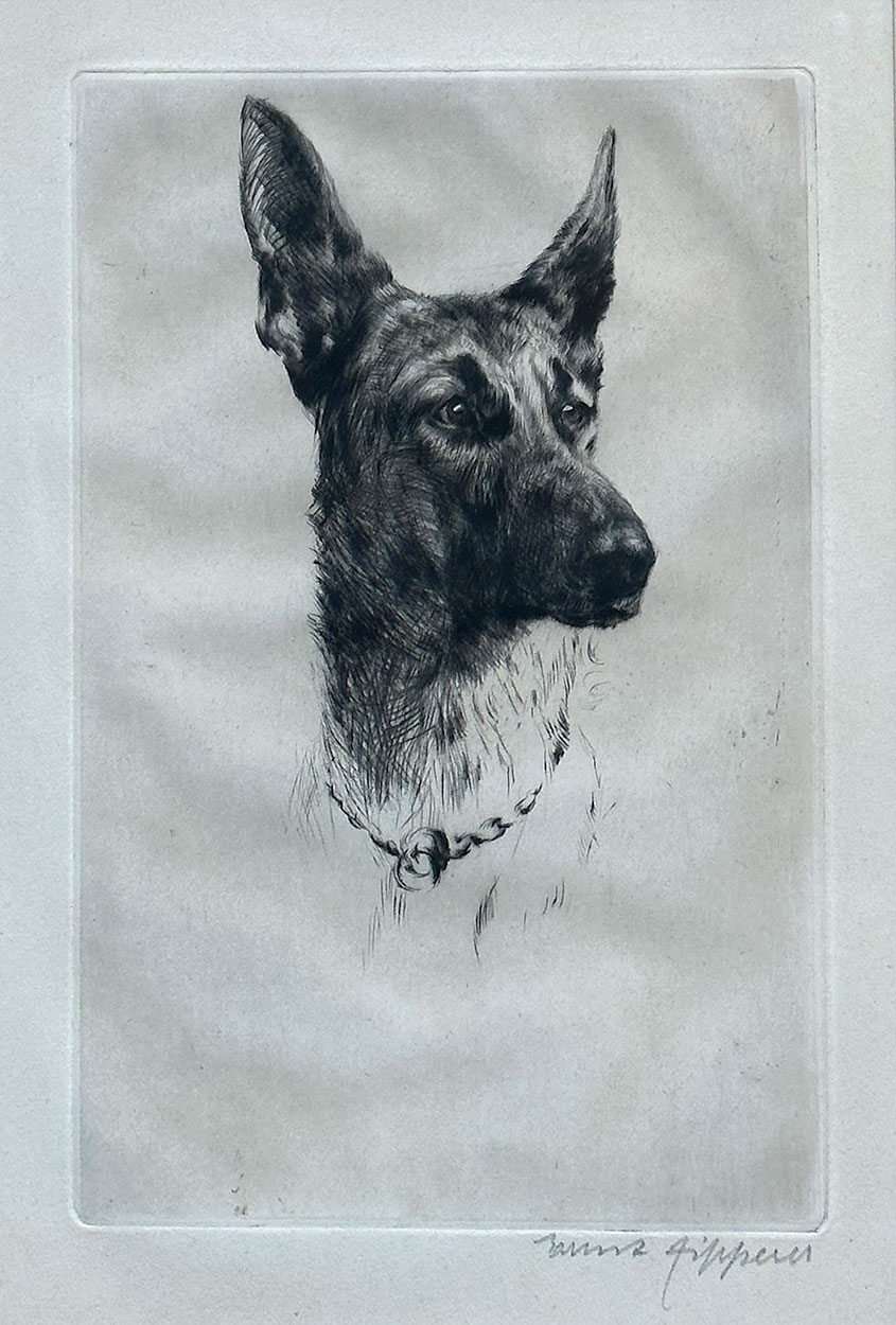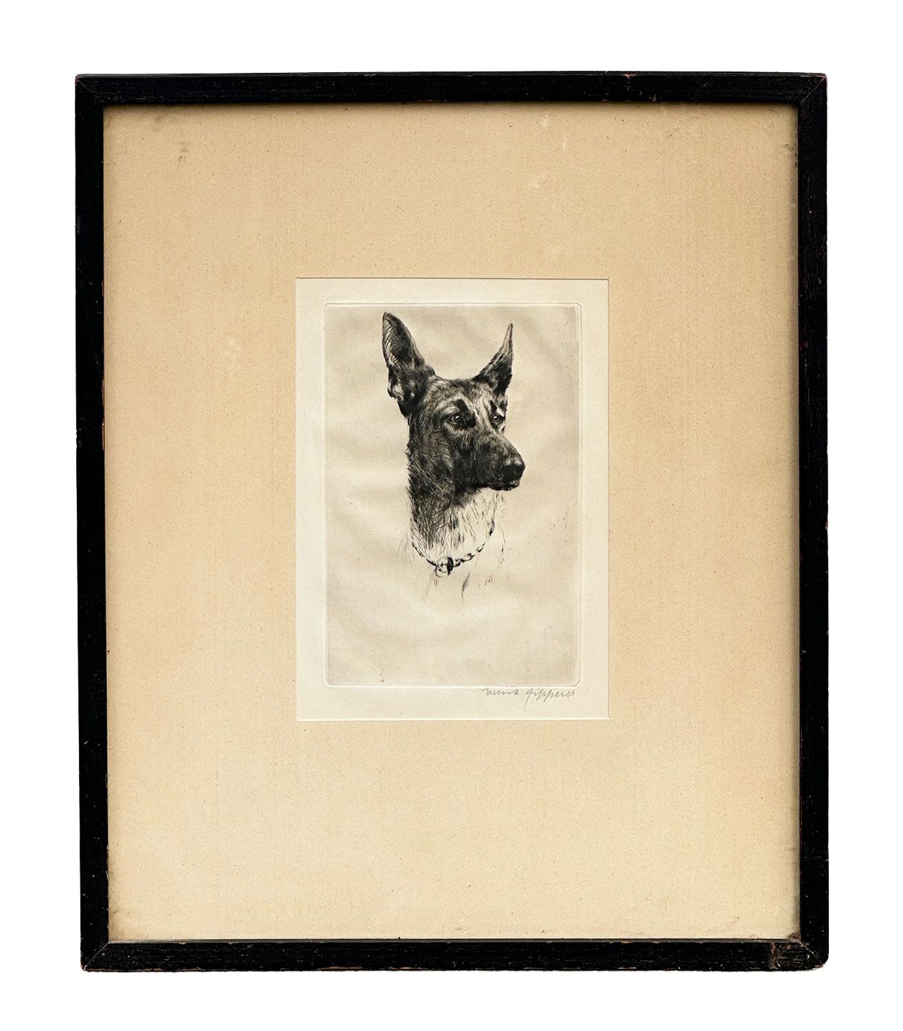 Ernst Zipperer (Germany, 1888-1982) Hand Signed Etching - German Shepherd. Circa 1920's. In Very Good/Excellent Condition. 13.75" x 16.5" (frame size). Frame and matting has some wear and tear.