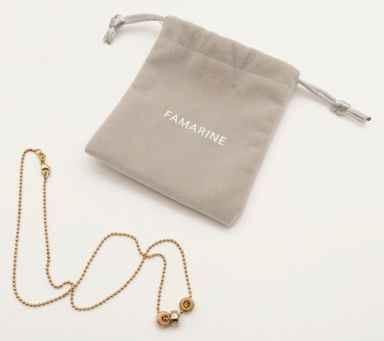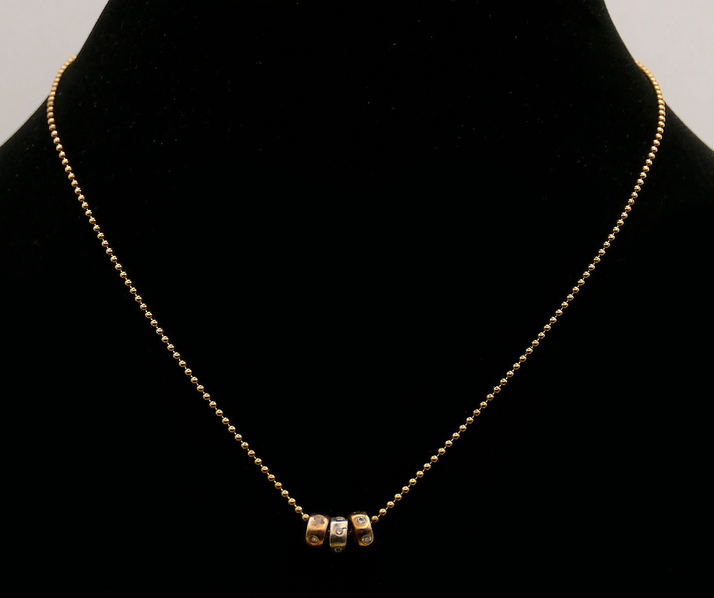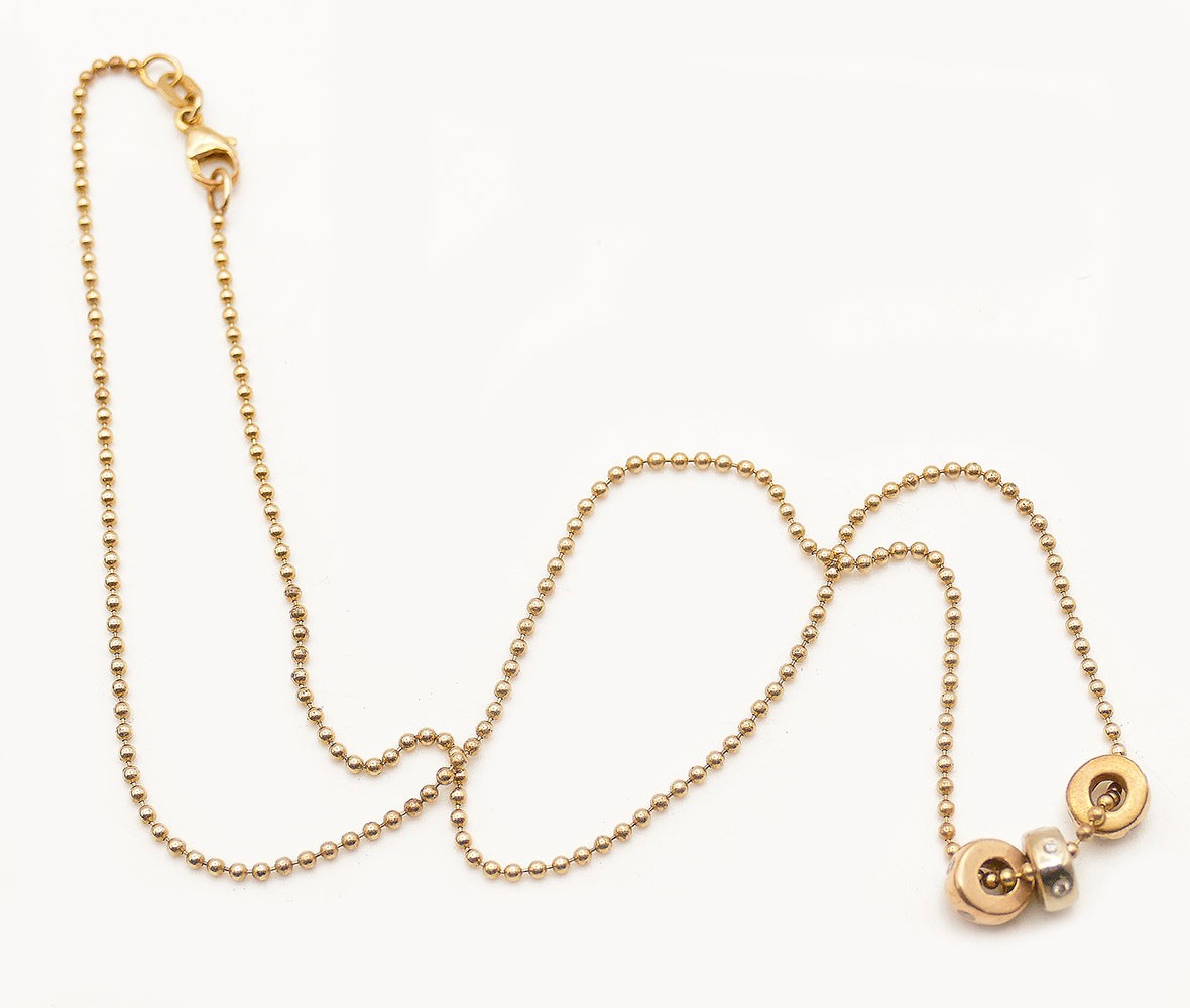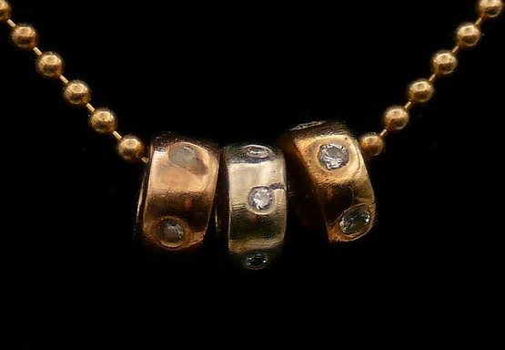Famarine 14 KT Gold Necklace With Three Gold Roundels. Made in Italy. Marked "585" and "Italy". 16" Chain. In Very Good Condition. Total Weight: 6.75 Grams (.22 Troy Ounces).