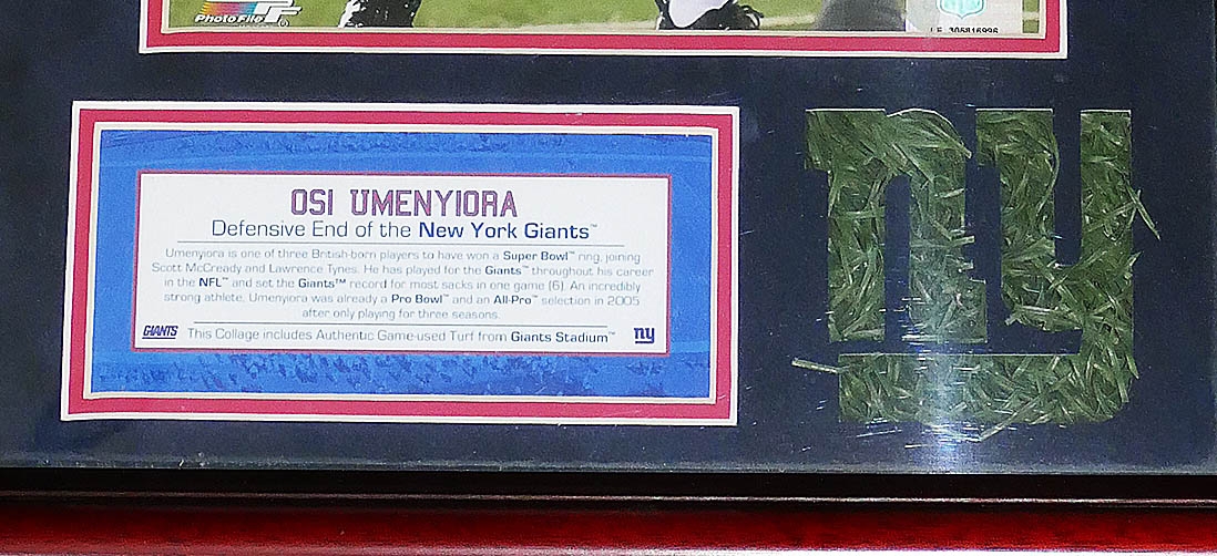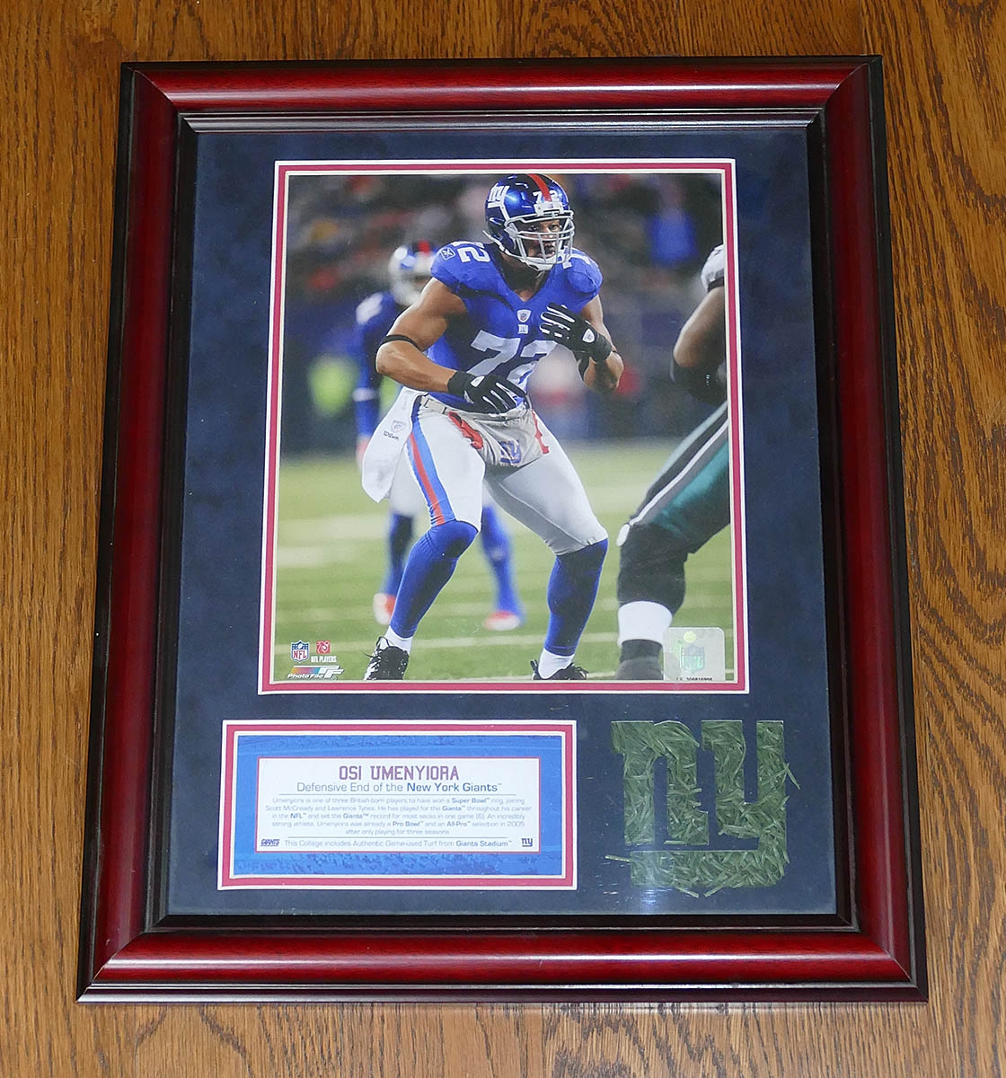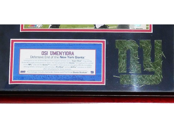 NY Giants Osi Umenyiora Licensed Photo & Authentic Giants Stadium Turf. Nicely Framed and includes a COA from Steiner Sports.